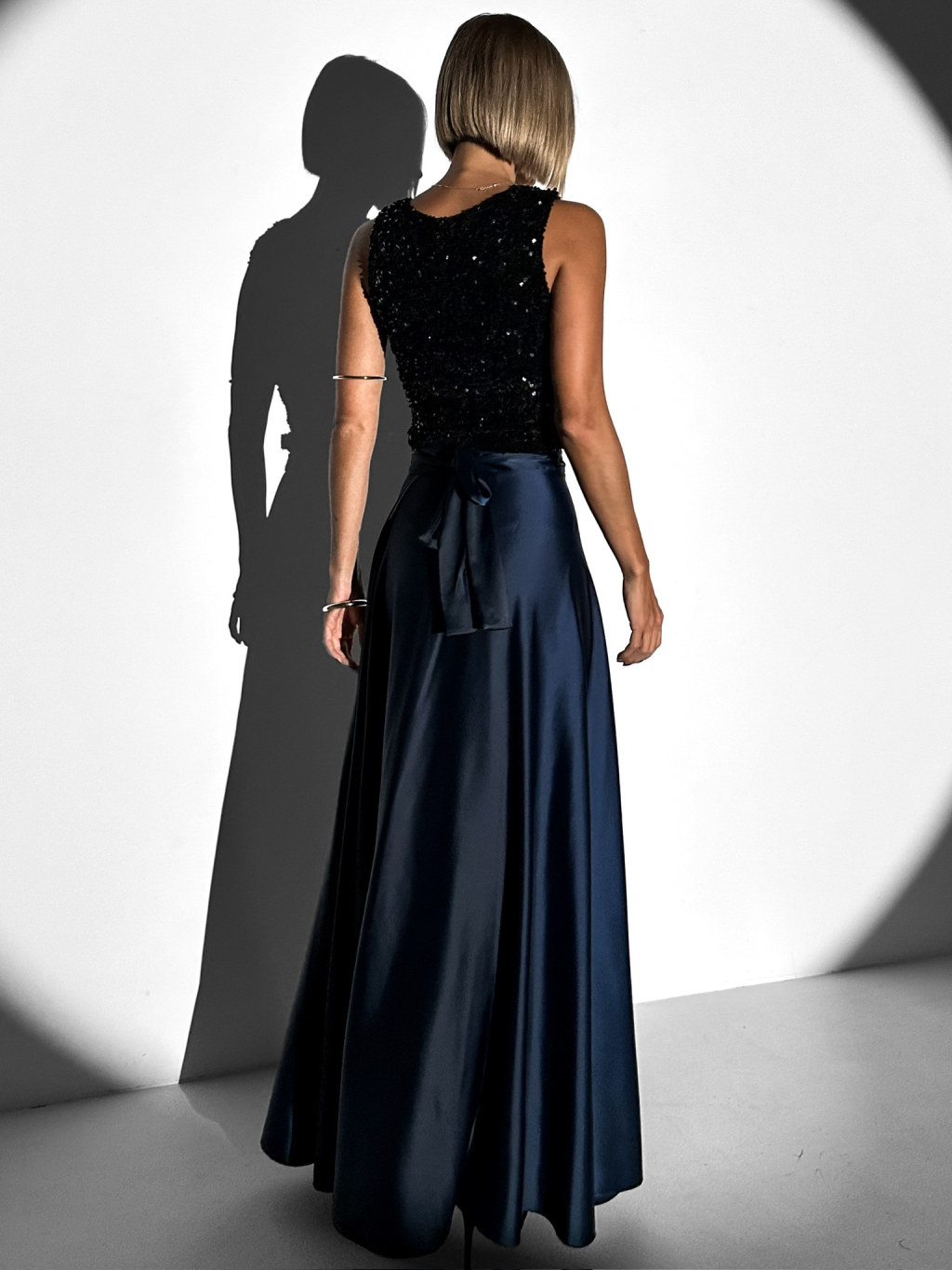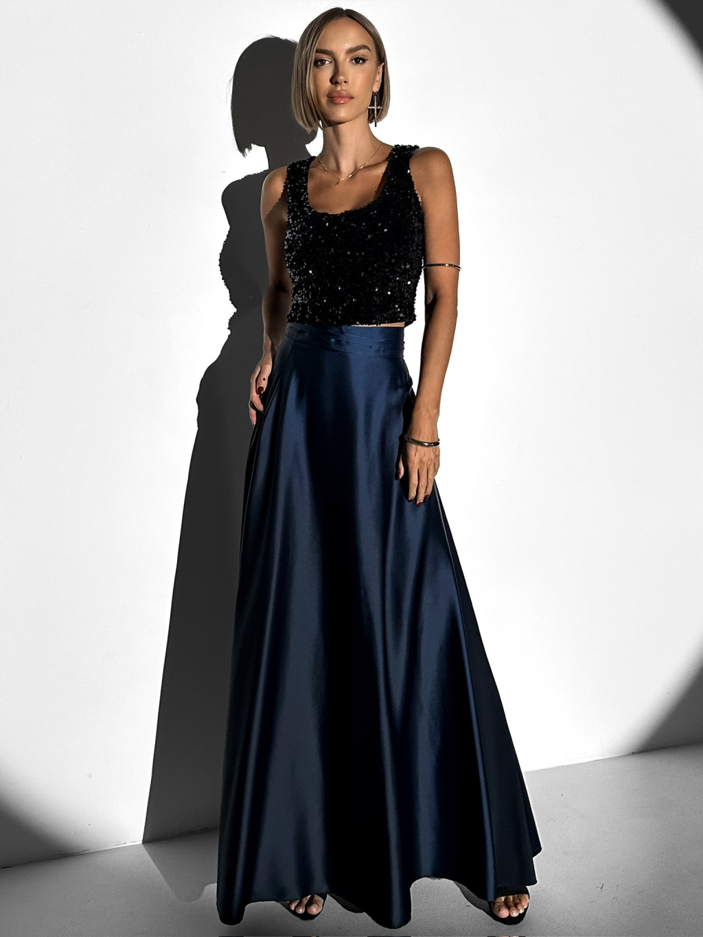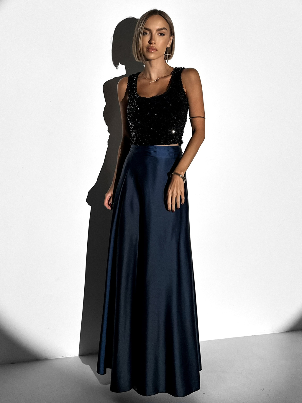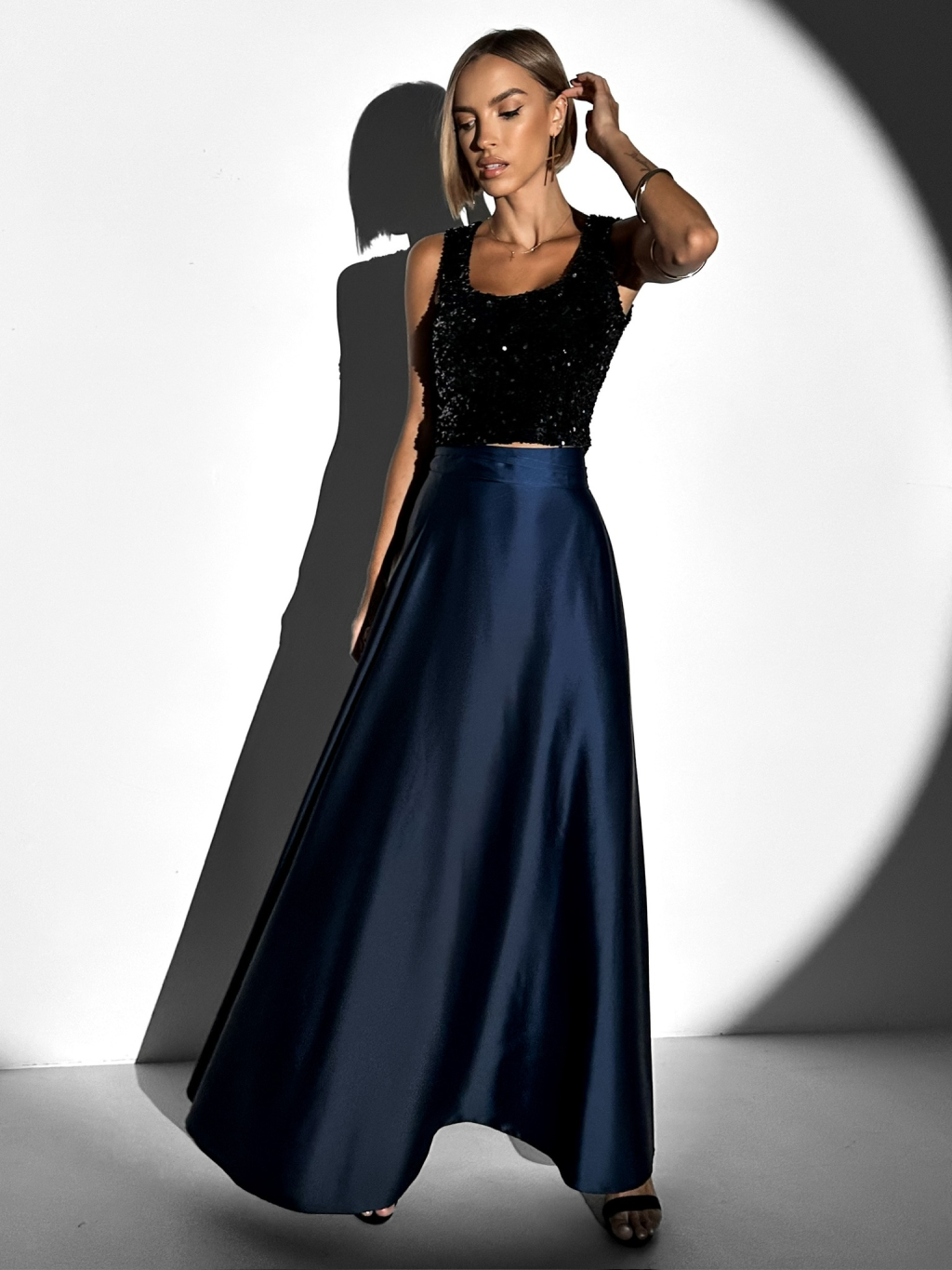 Tmavomodrá dlhá saténová sukňa DENISSE zavinovací