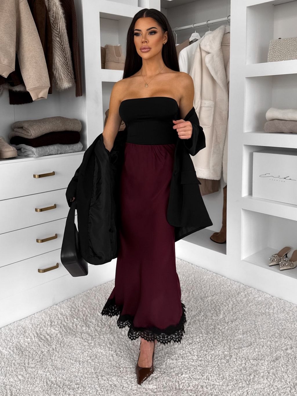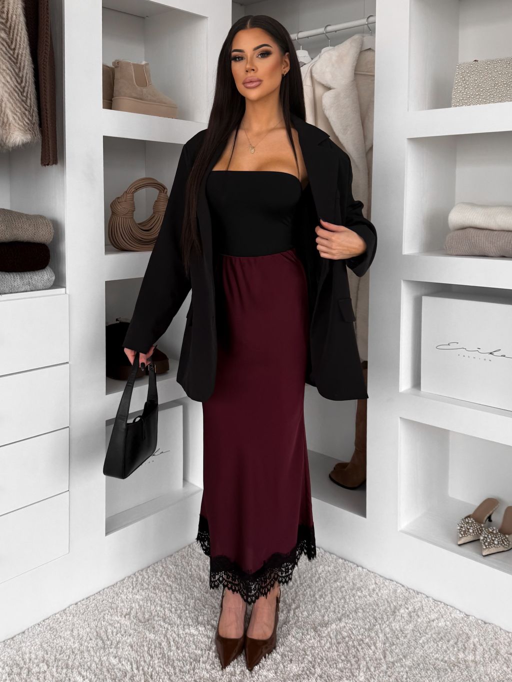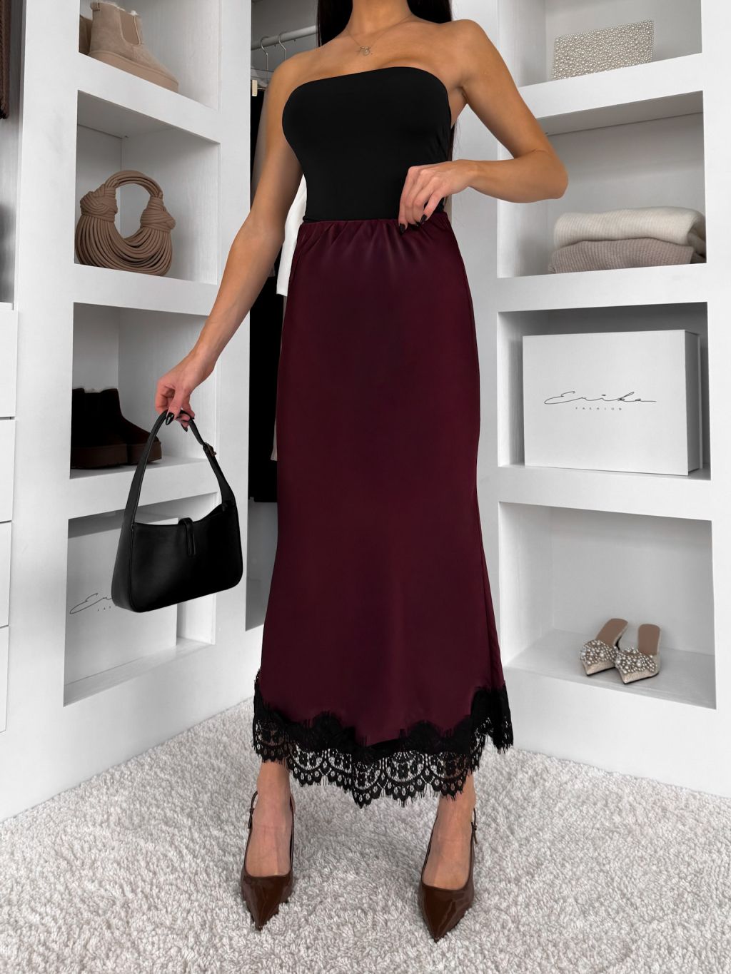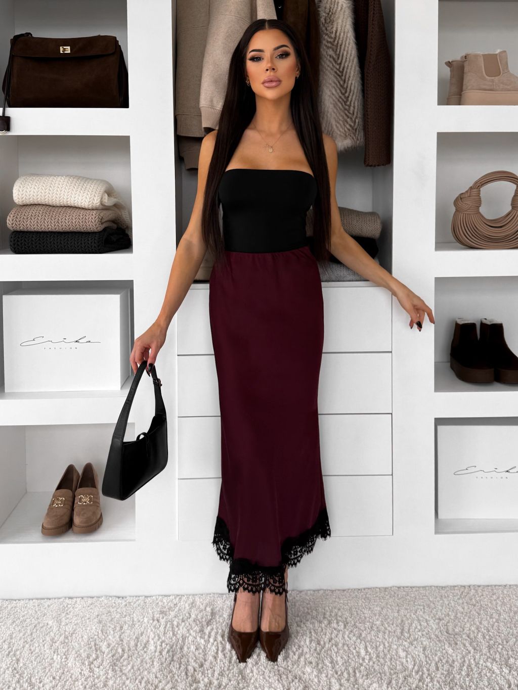 Bordová elegantná saténová midi sukňa SKAYA