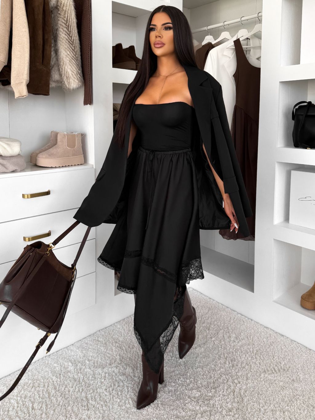 Čierna saténová elegantná sukňa DRIMMLO s čipkou