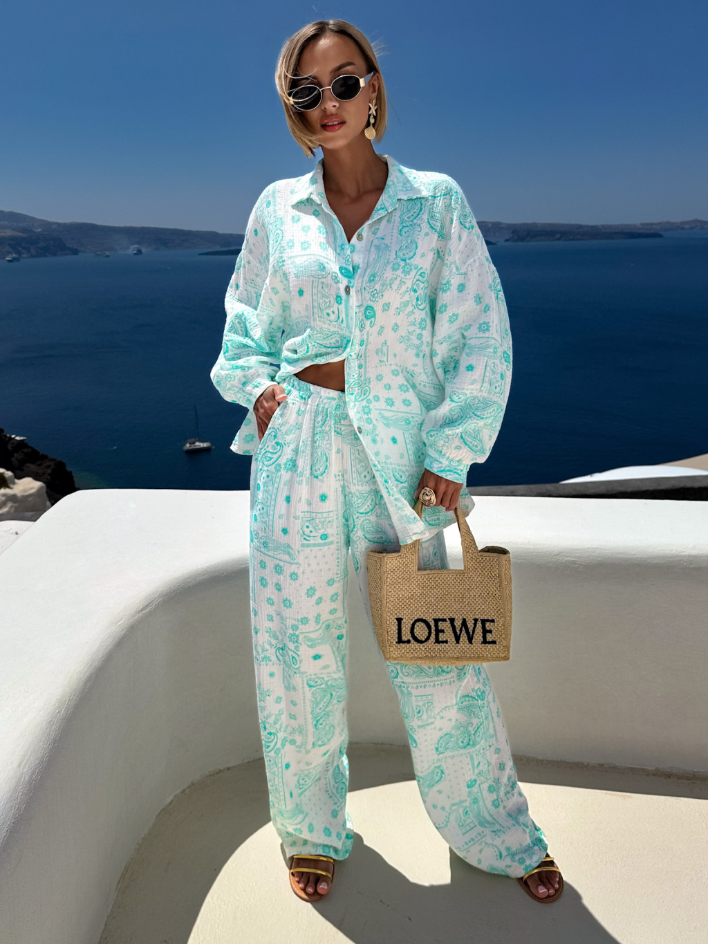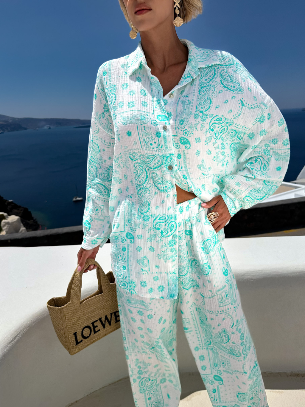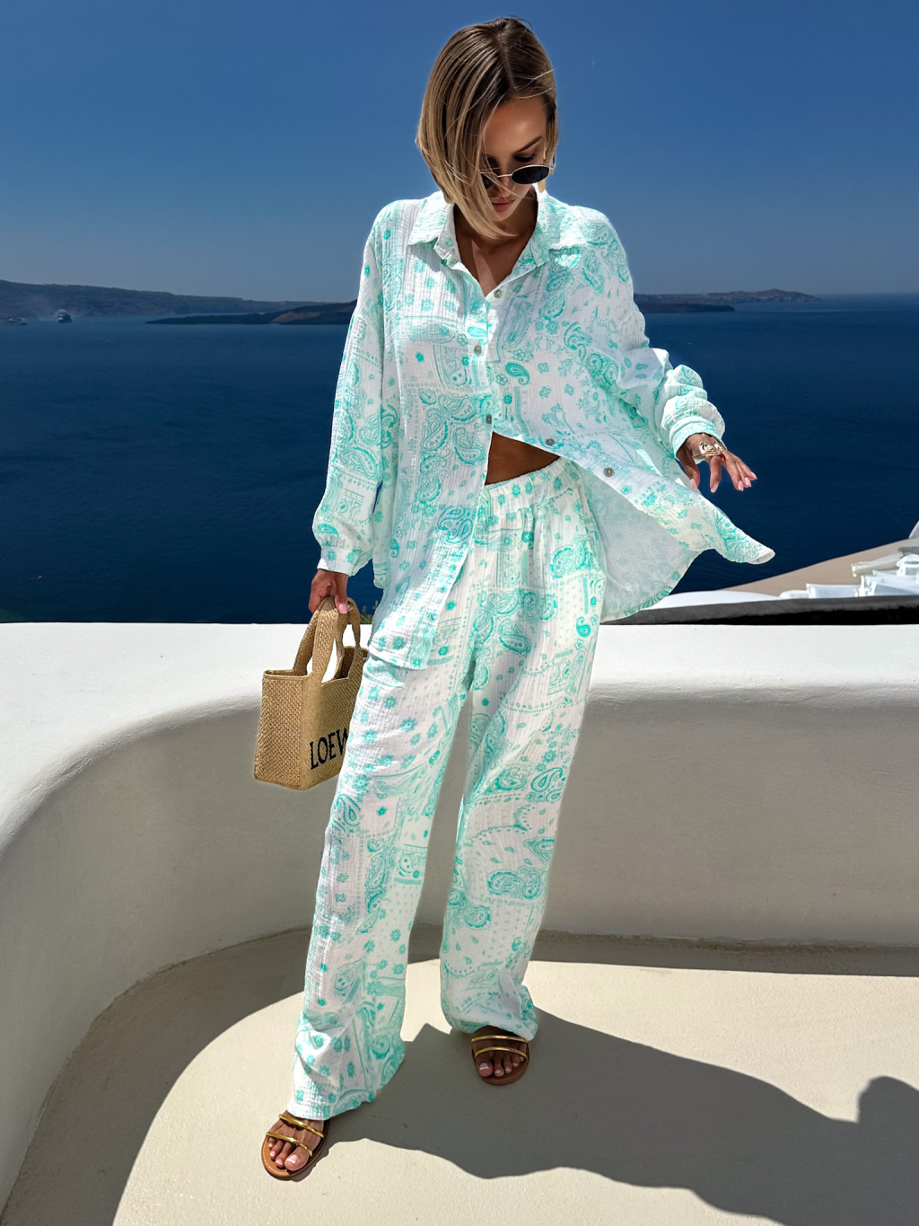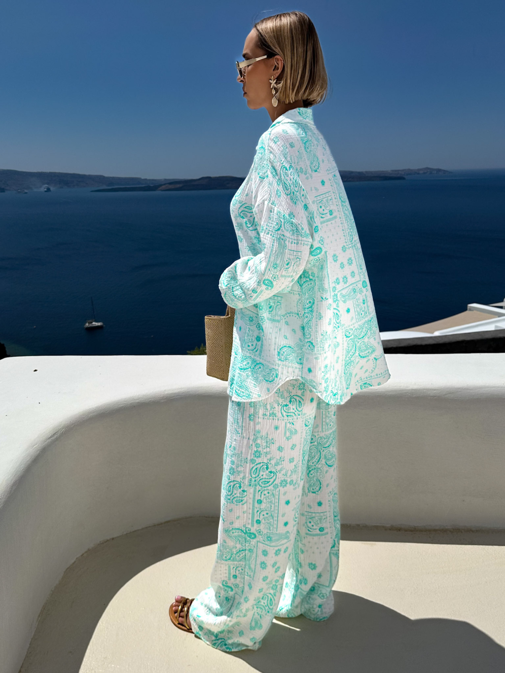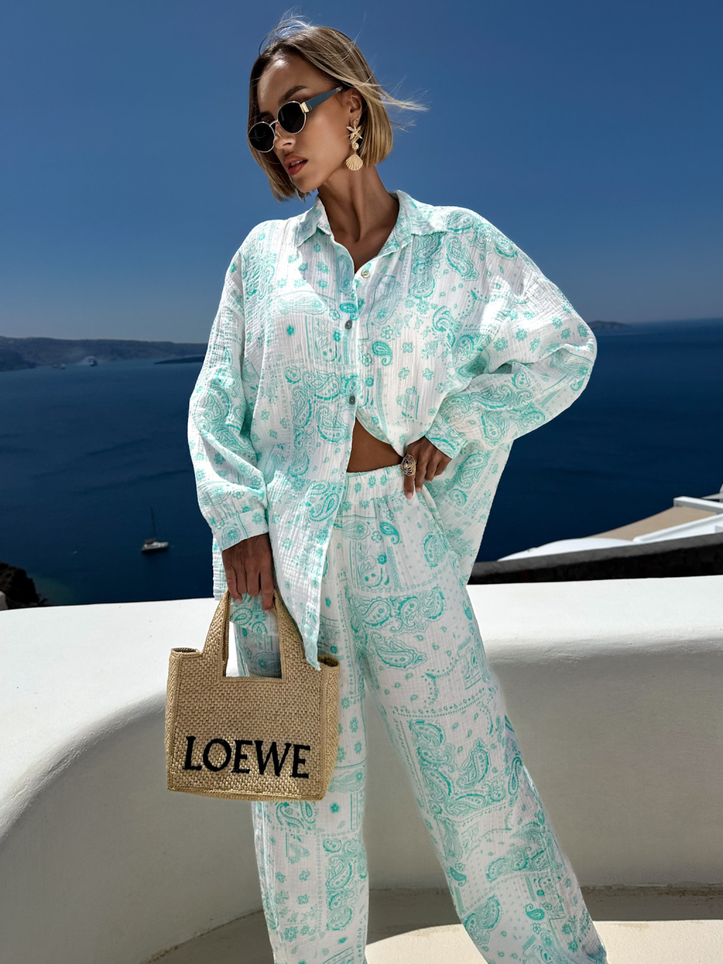 Bielotyrkysový nohavicový mušelínový komplet NORINA