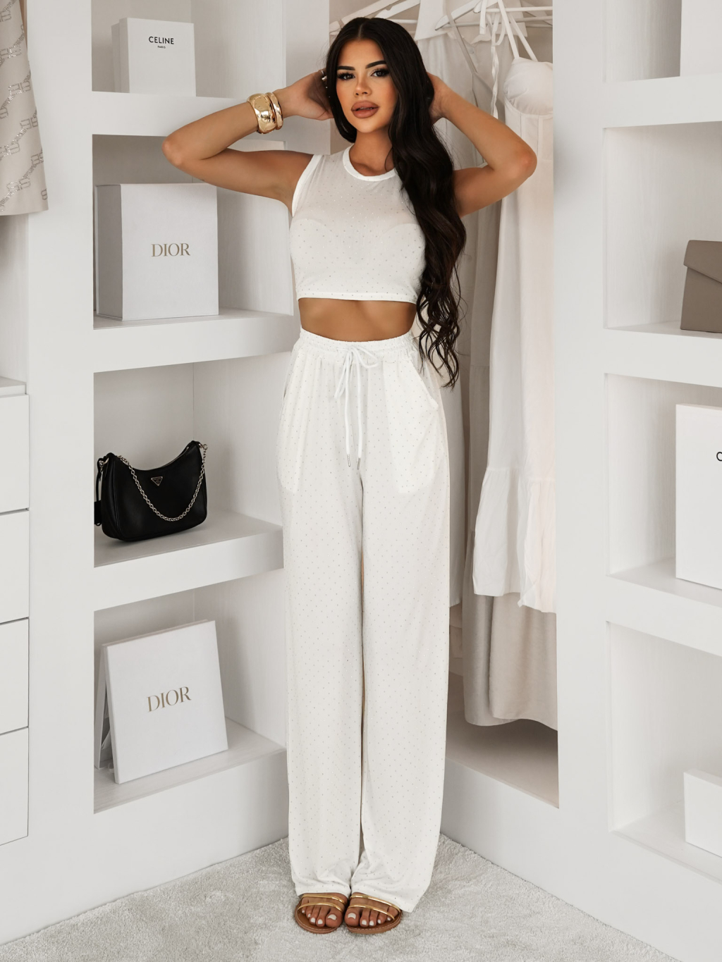 Biely nohavicový komplet KRAVÉTH s kamienkami