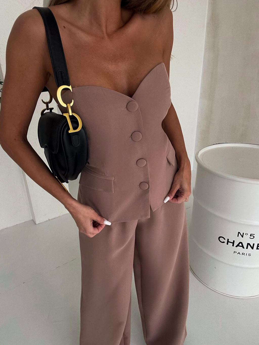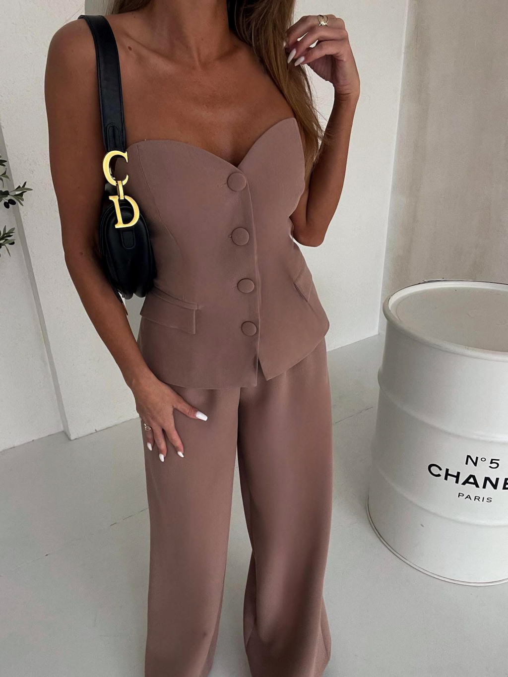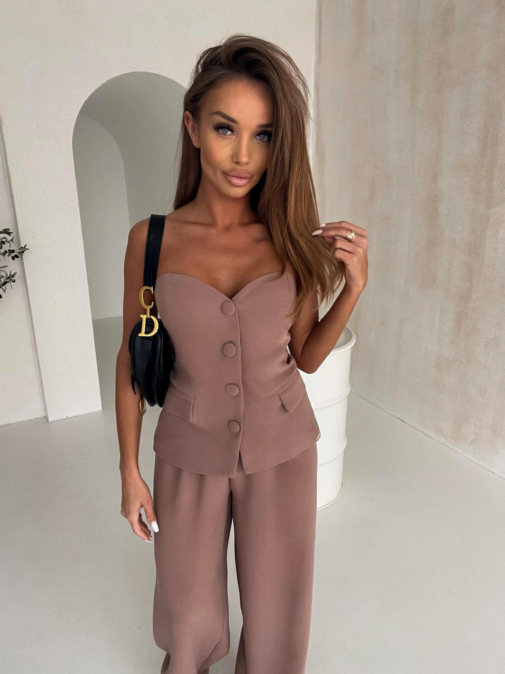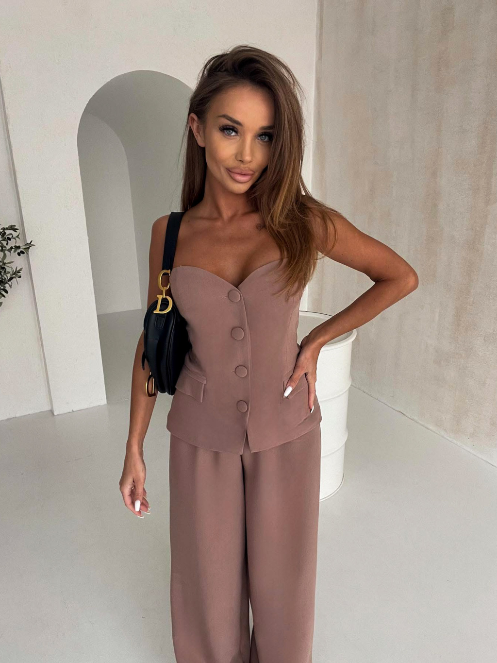 Hnedý elegantný nohavicový komplet SANARI s korzetom