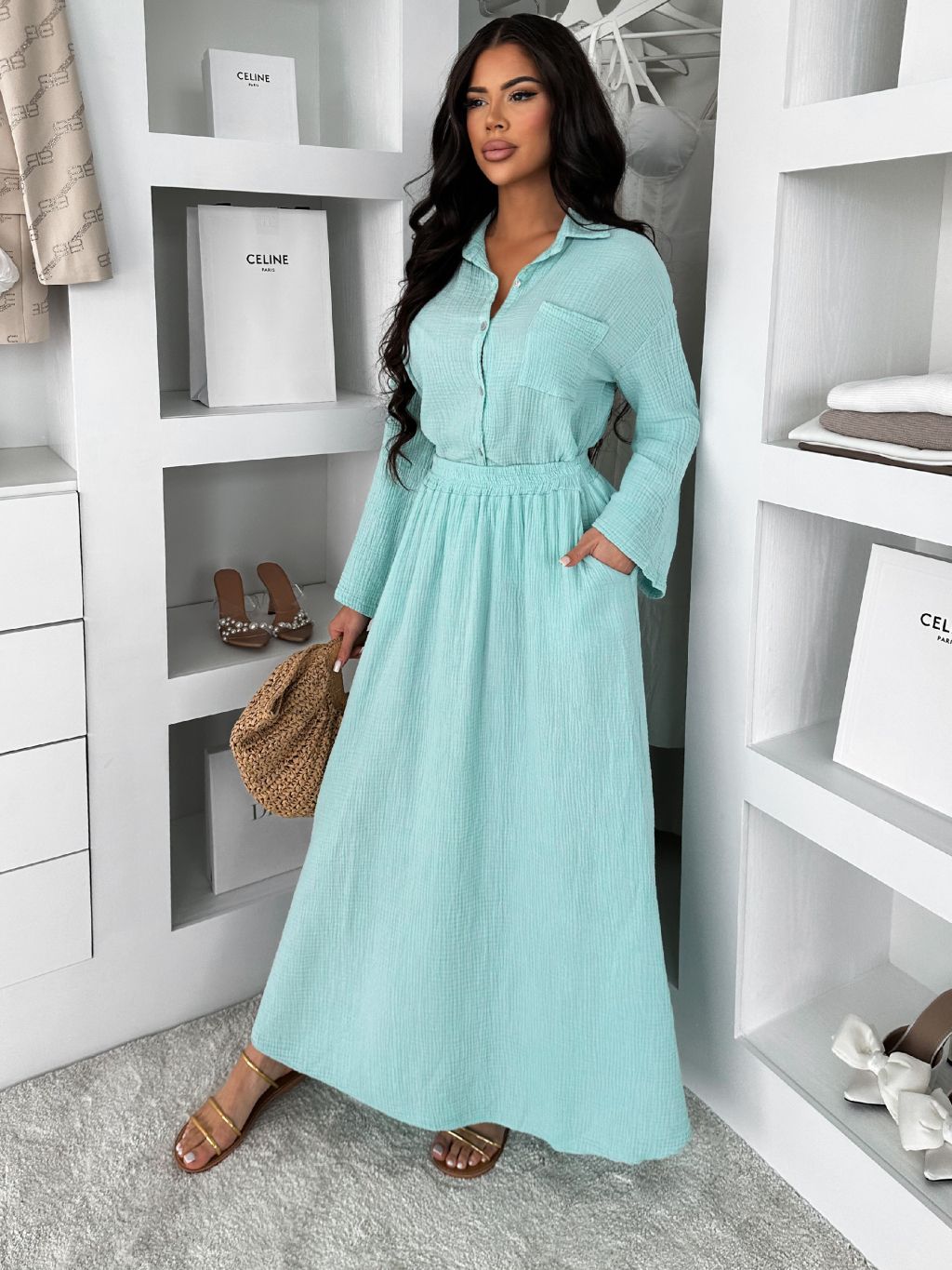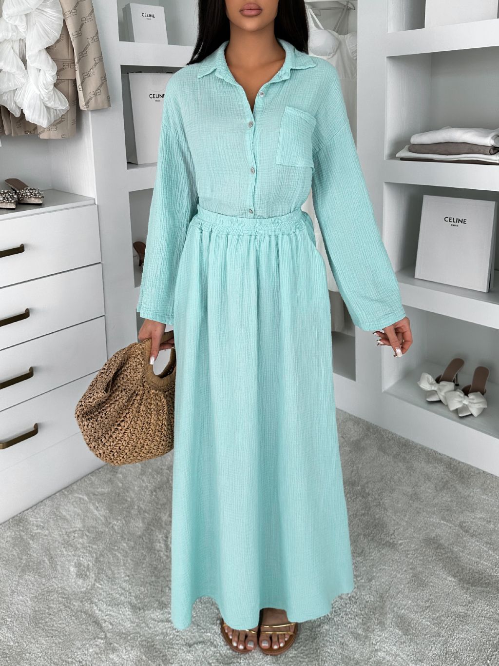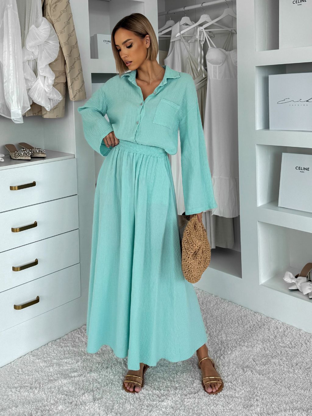 Svetlozelený mušelínový košeľový komplet BELIANE so sukňou