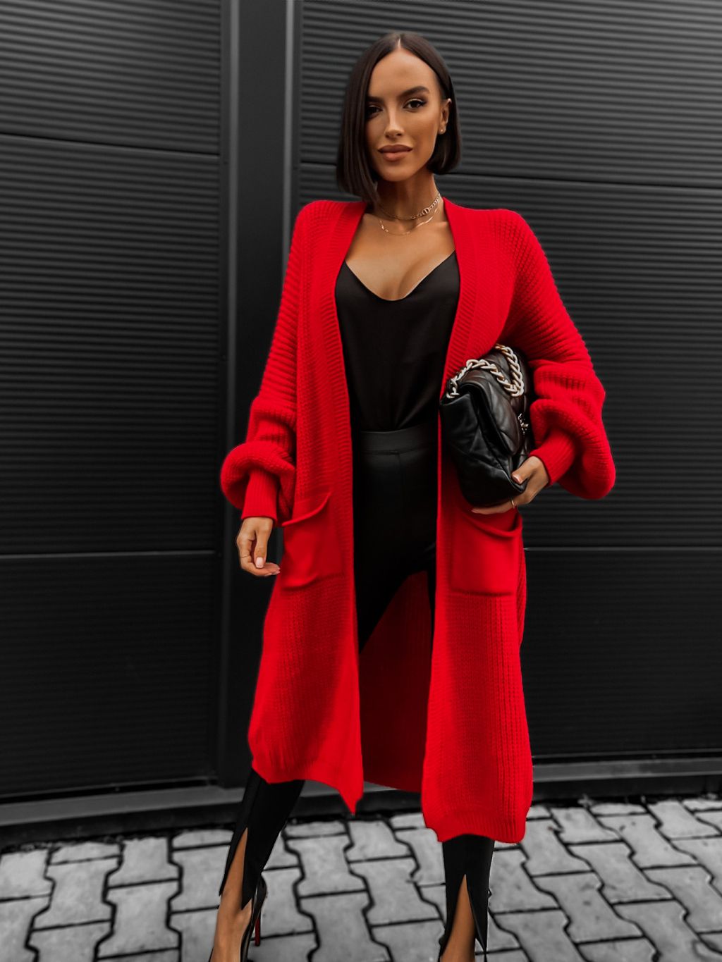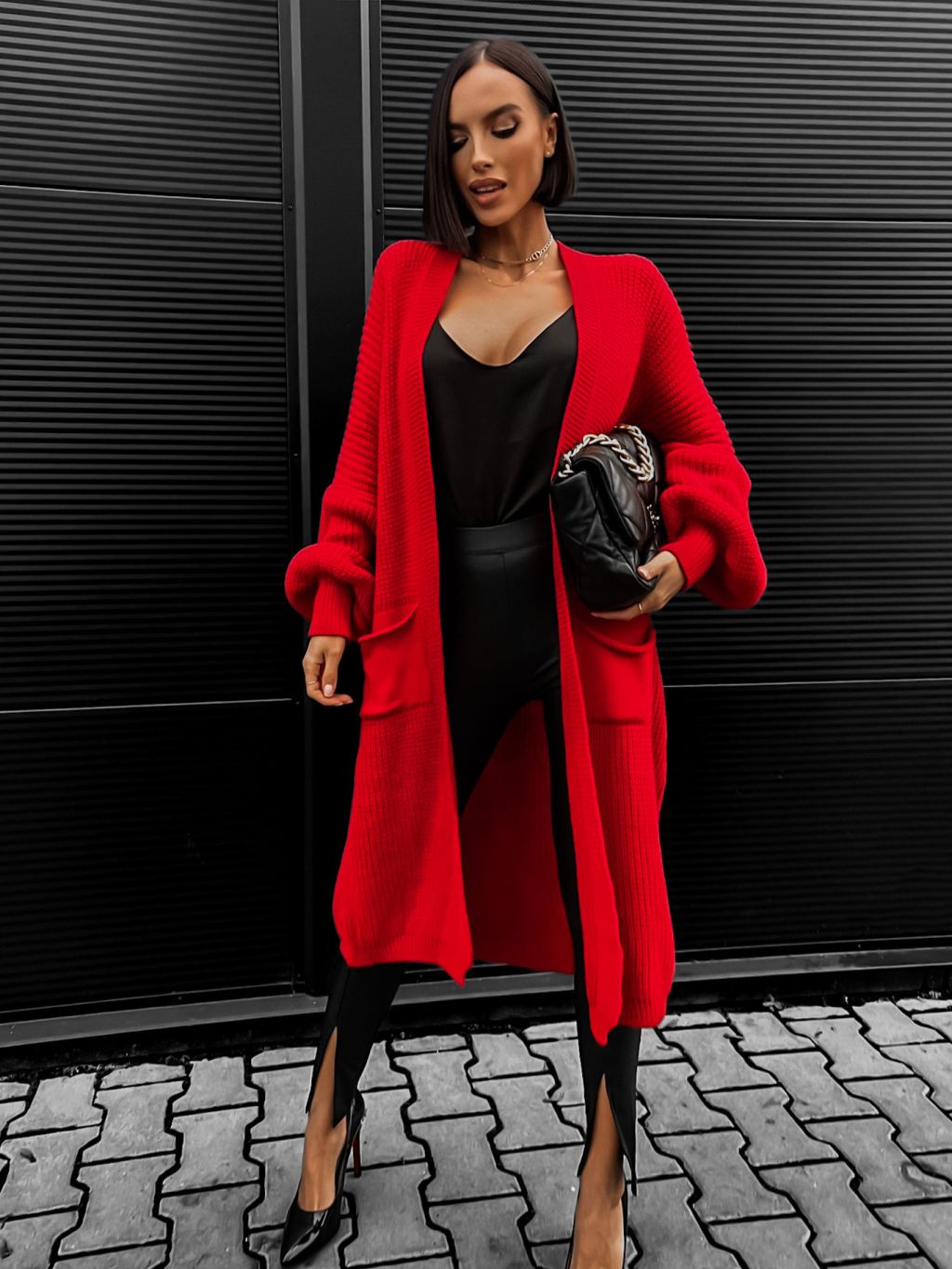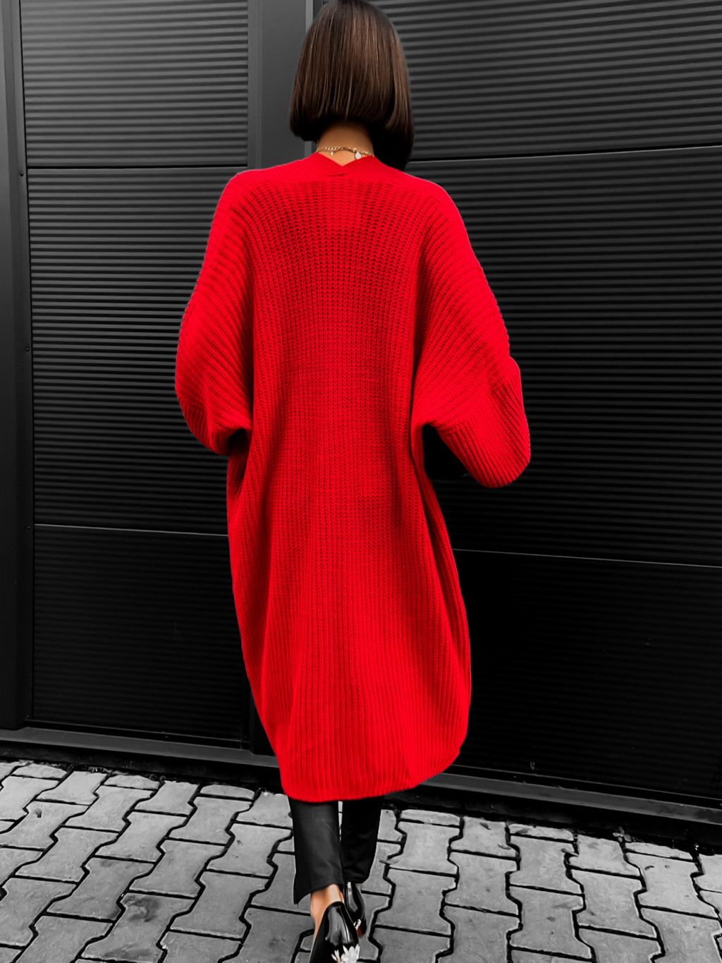 Červený cardigan SENTENCE otevřeného střihu