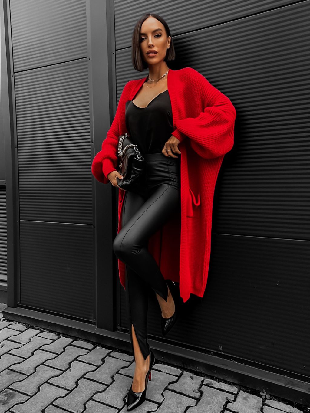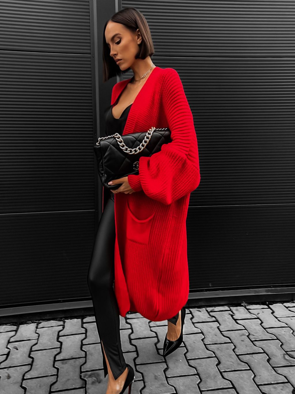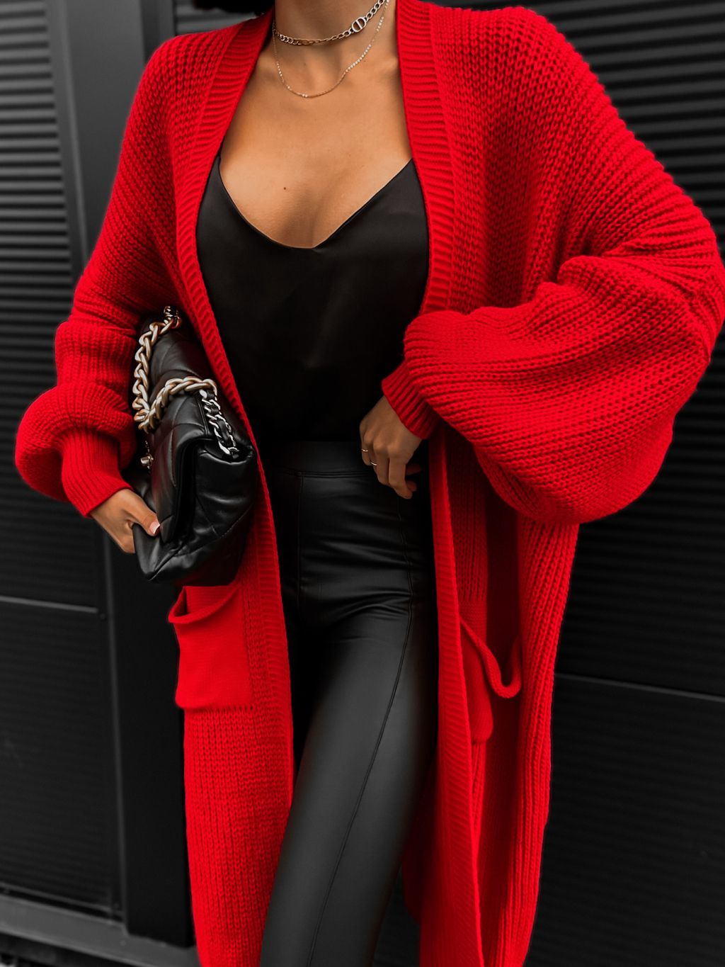 Červený cardigan SENTENCE otevřeného střihu