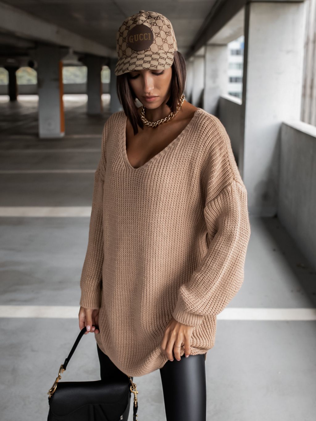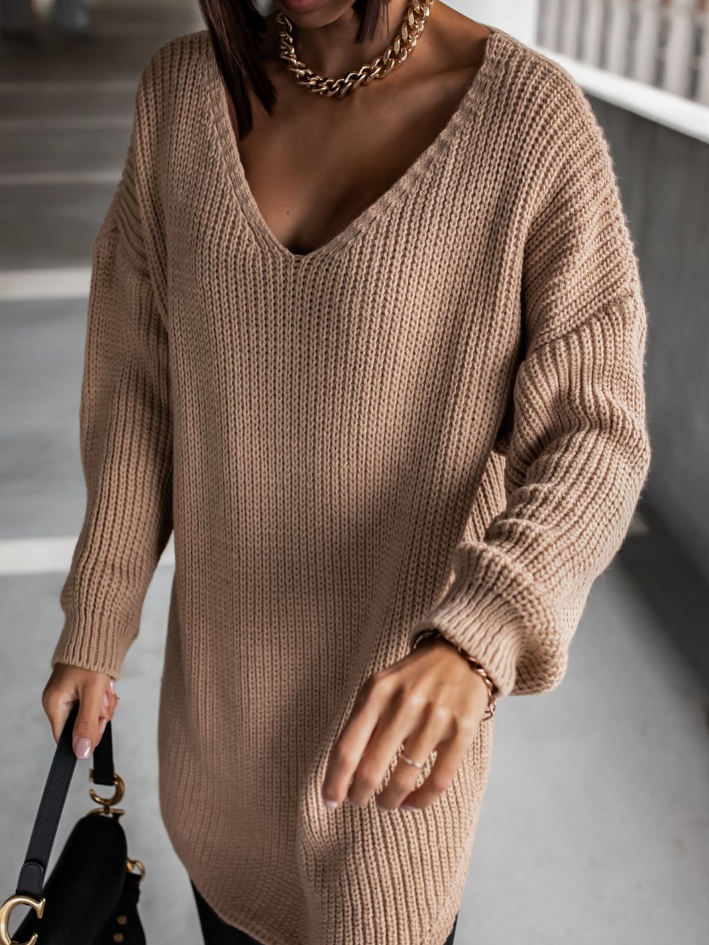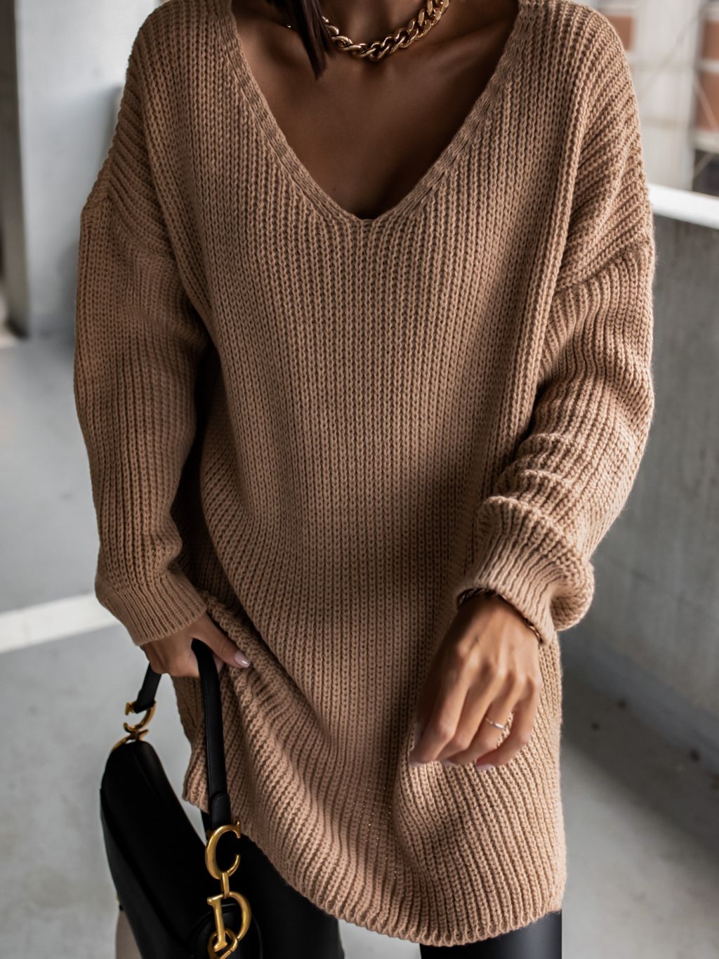 Hnedý pletený sveter CERTAIN s výstrihom