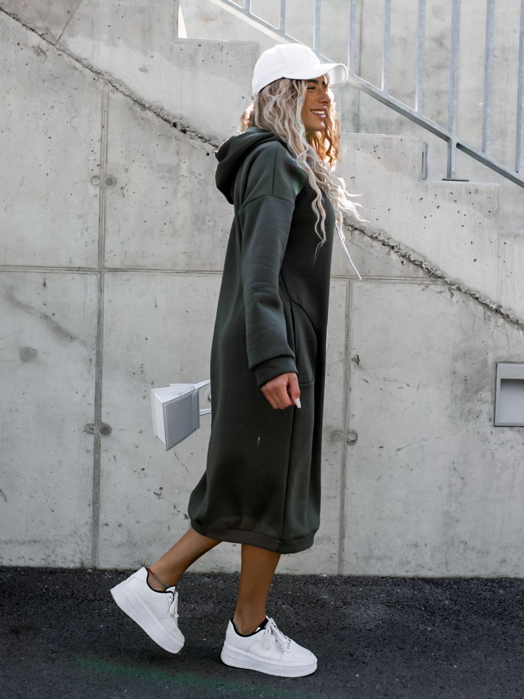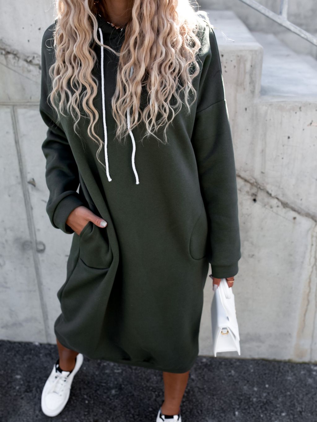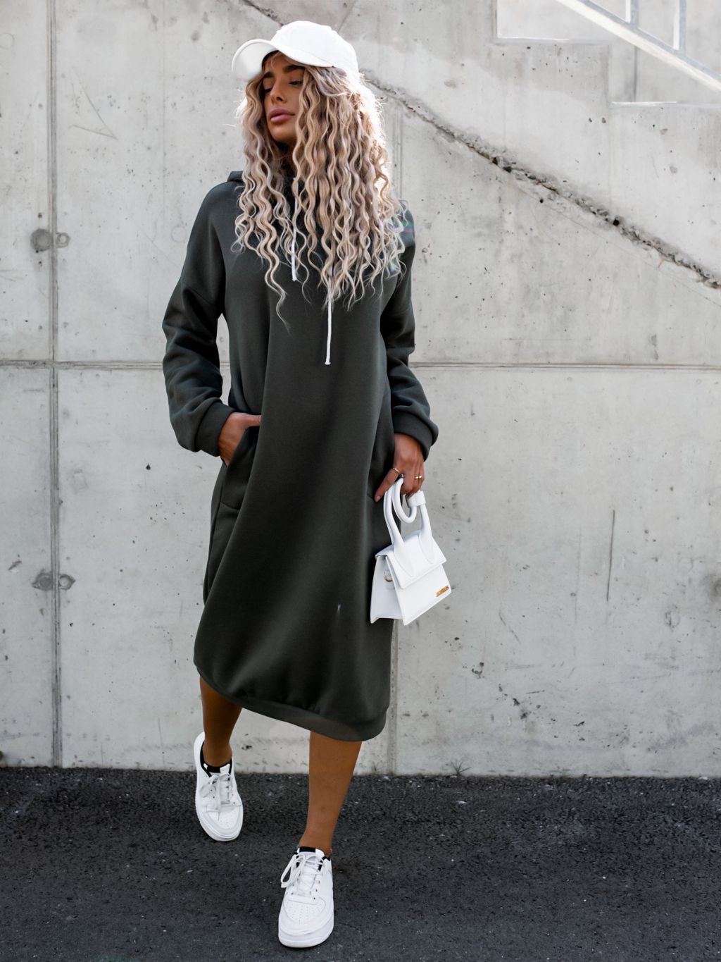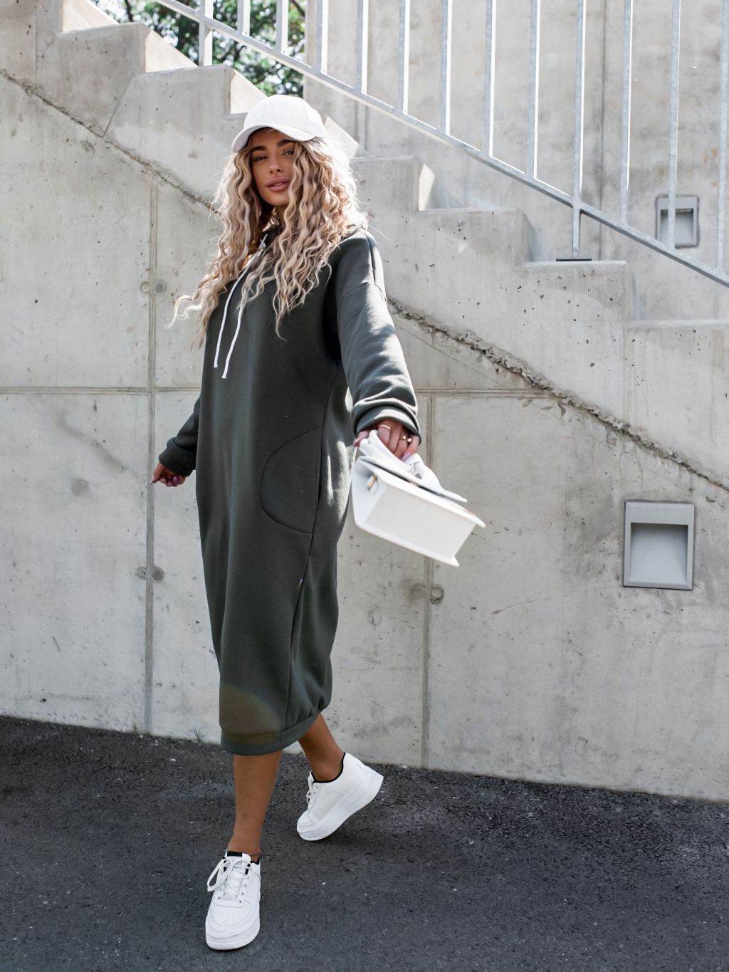 Khaki dlhé mikinové šaty DARINNE s kapucňou