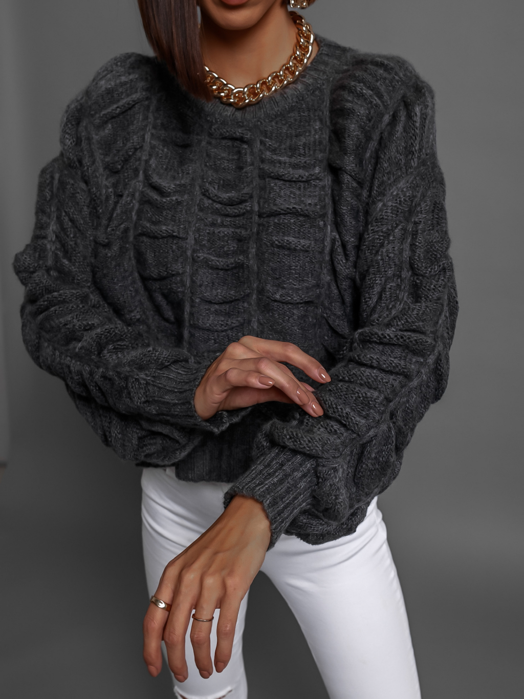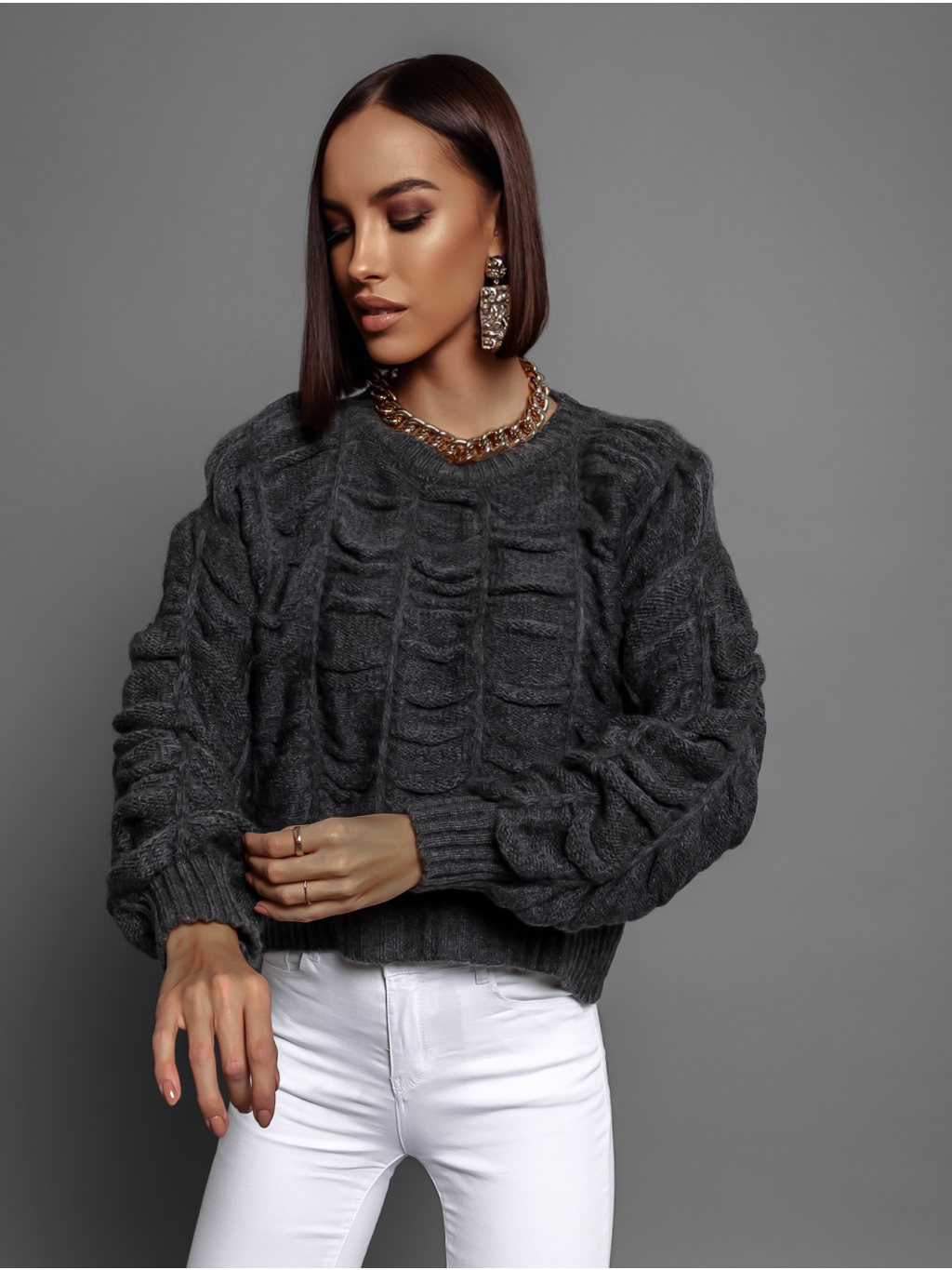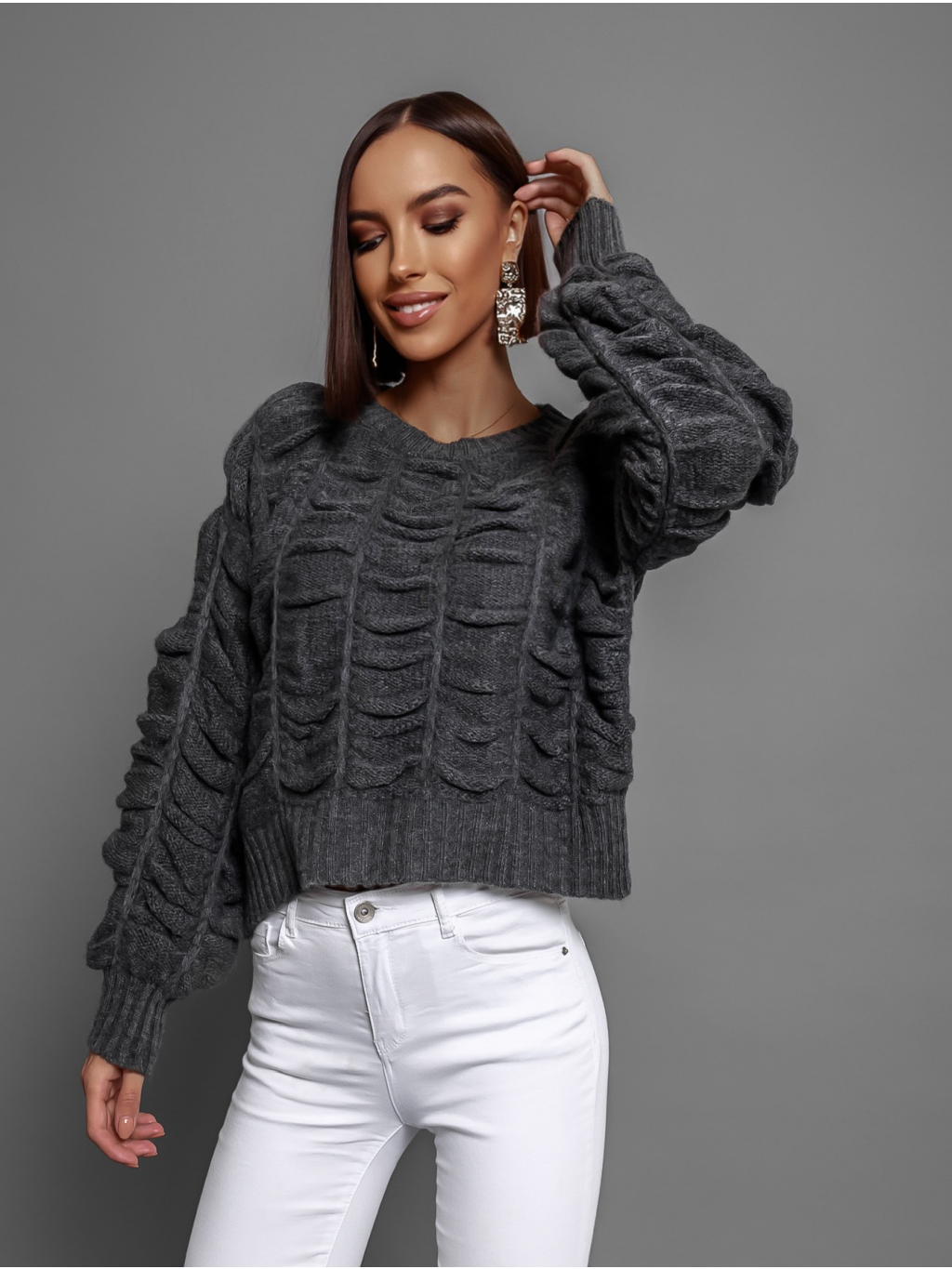 Tmavosivý nariasený sveter DROPPY s voľnými rukávmi