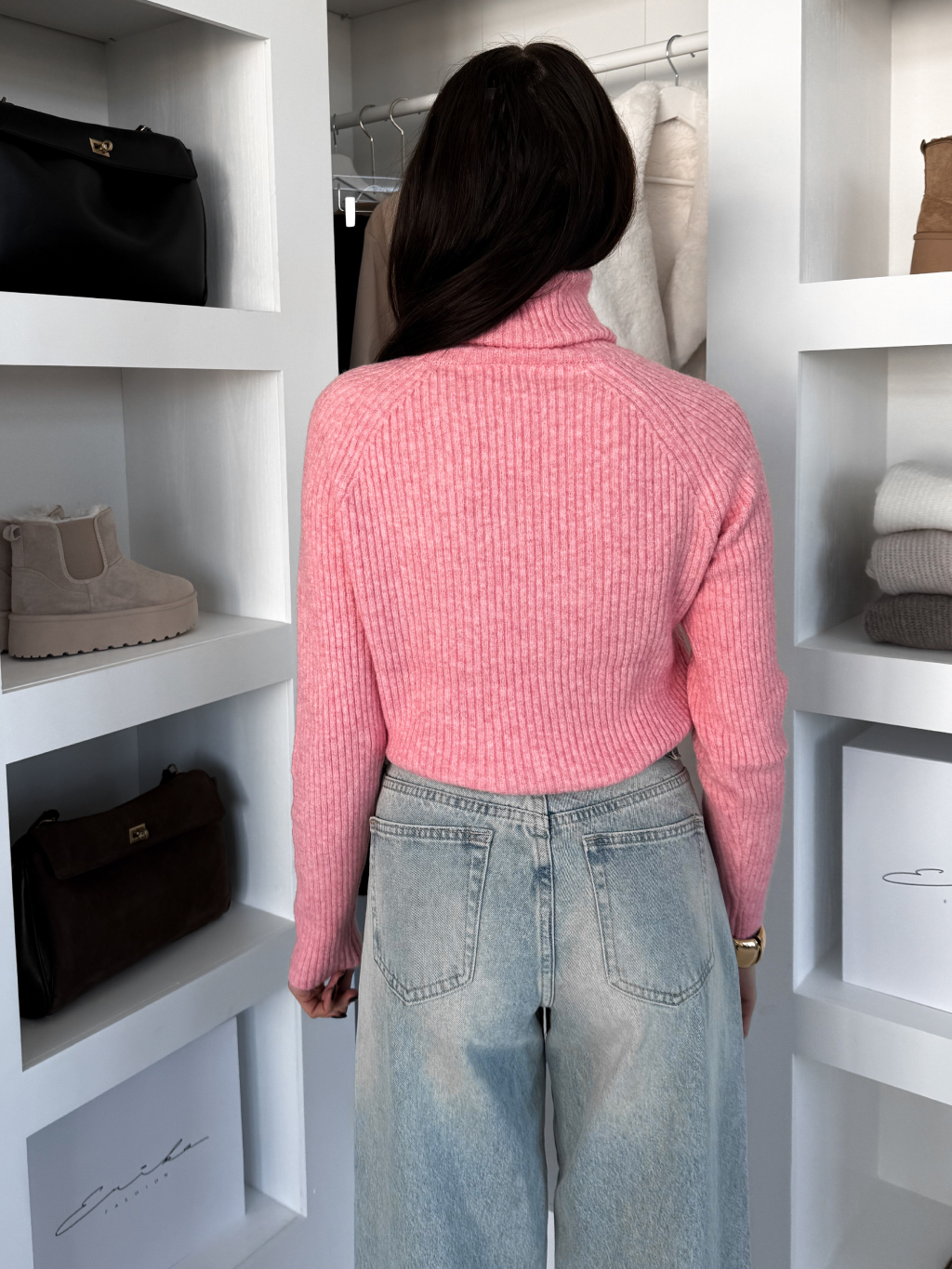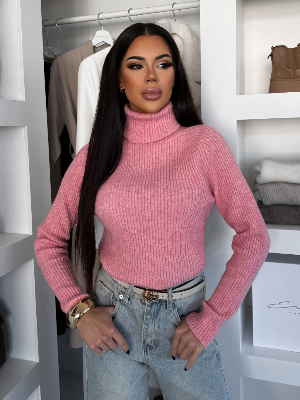 Ružový elegantný sveter rolák XANDRIA s golierom