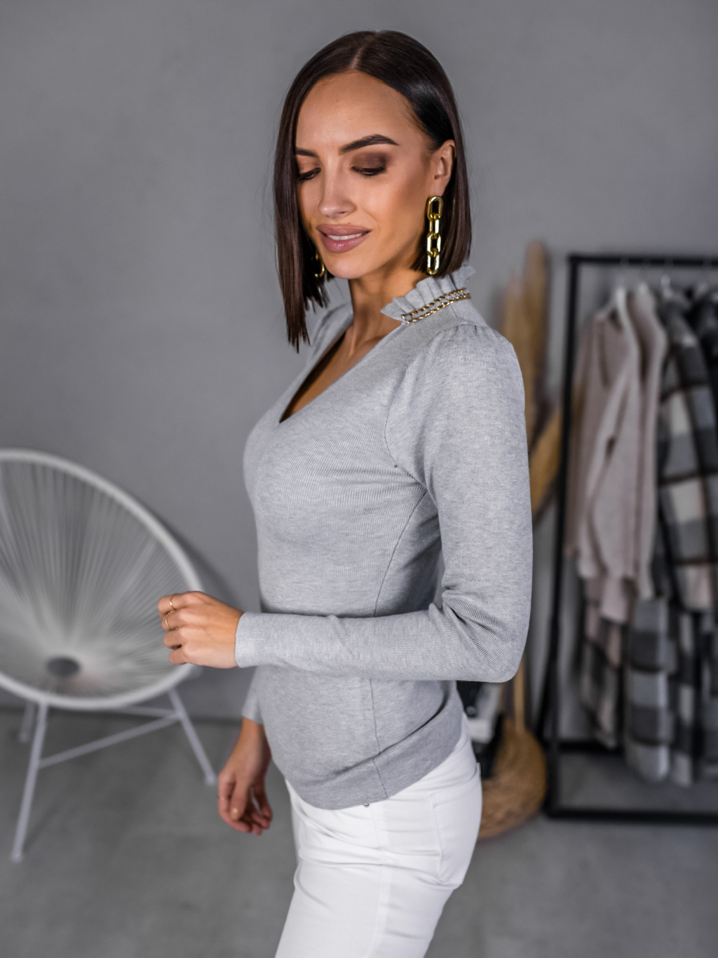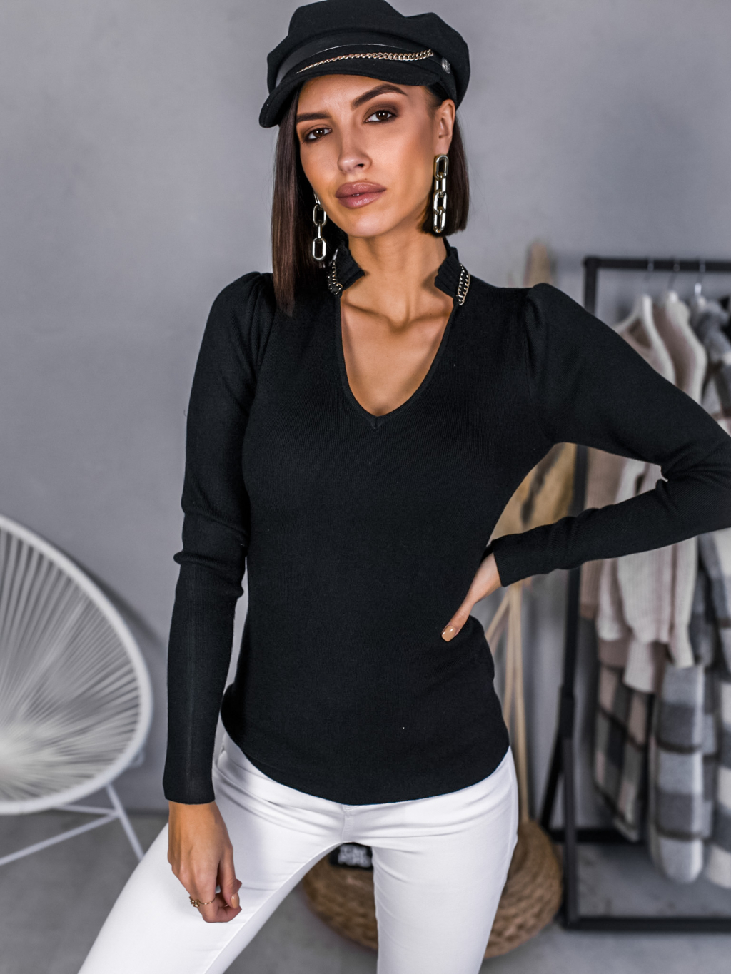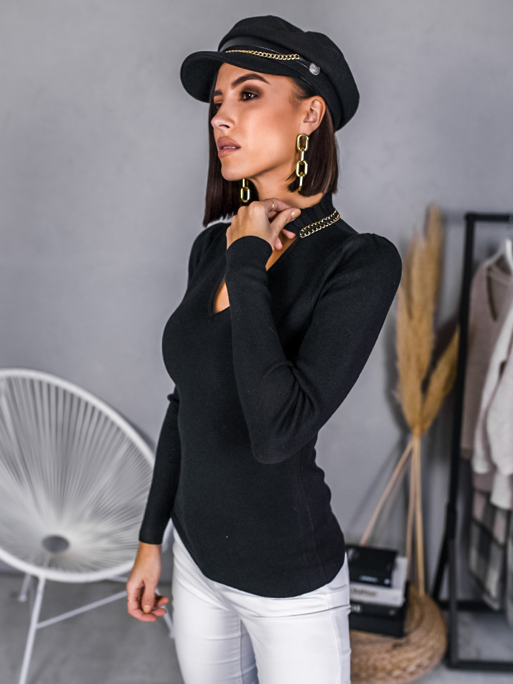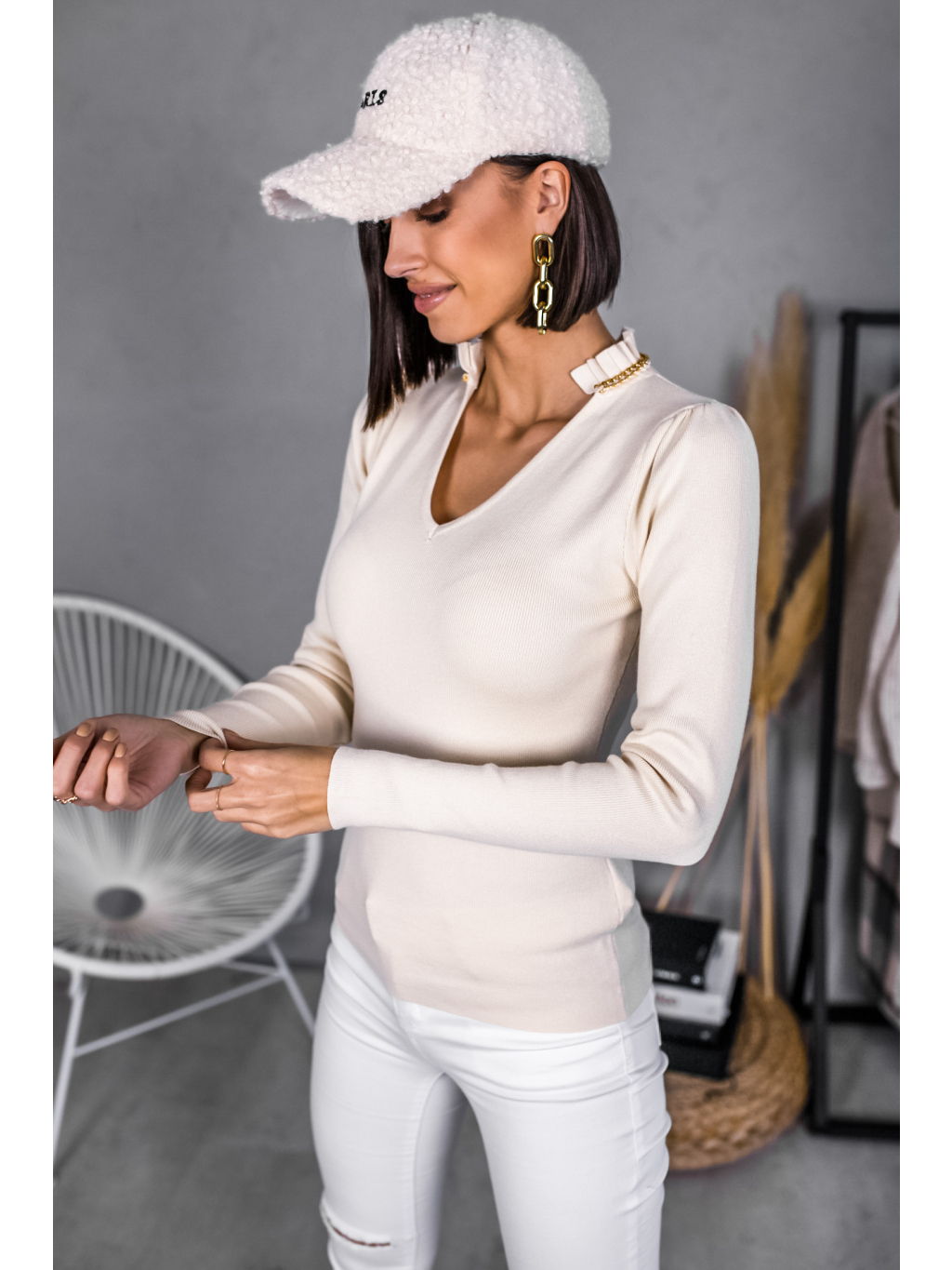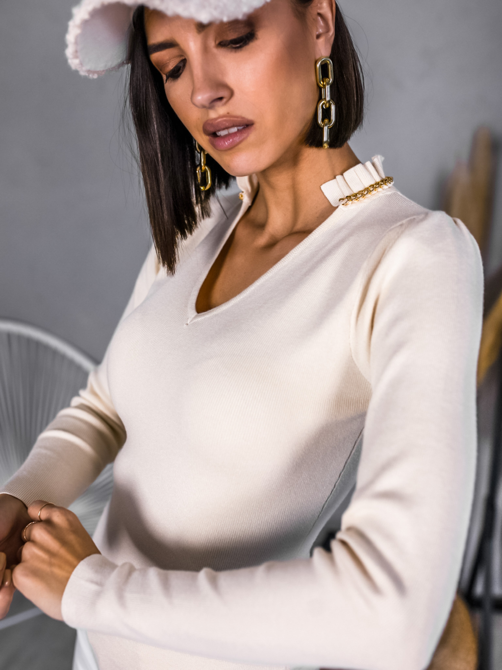 Svetrík Enzoria je vyrobený z veľmi príjemného a kvalitného materiálu. Svetrík má dlhý rukáv a výstrih do V. Pri krku je svetrík zdobený volánikom a retiazkou. Dĺžka tohto kúsku siaha pod bedrá. Vďaka strečovému sa dokonale prispôsobí Vašej postave. Svetrík Enzoria je ľahko kombinovateľným kúskom, ktorý patrí do základu každého štýlového šatníku.