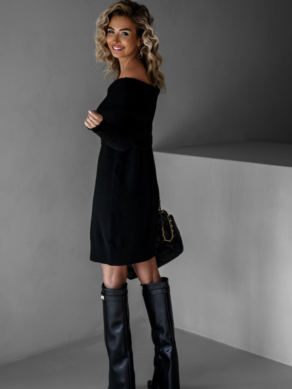 Čierne krátke svetrové šaty FAMULAN s odhalenými ramenami