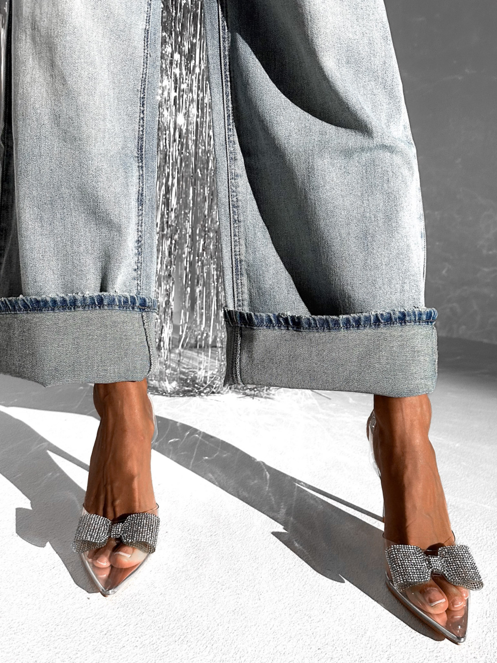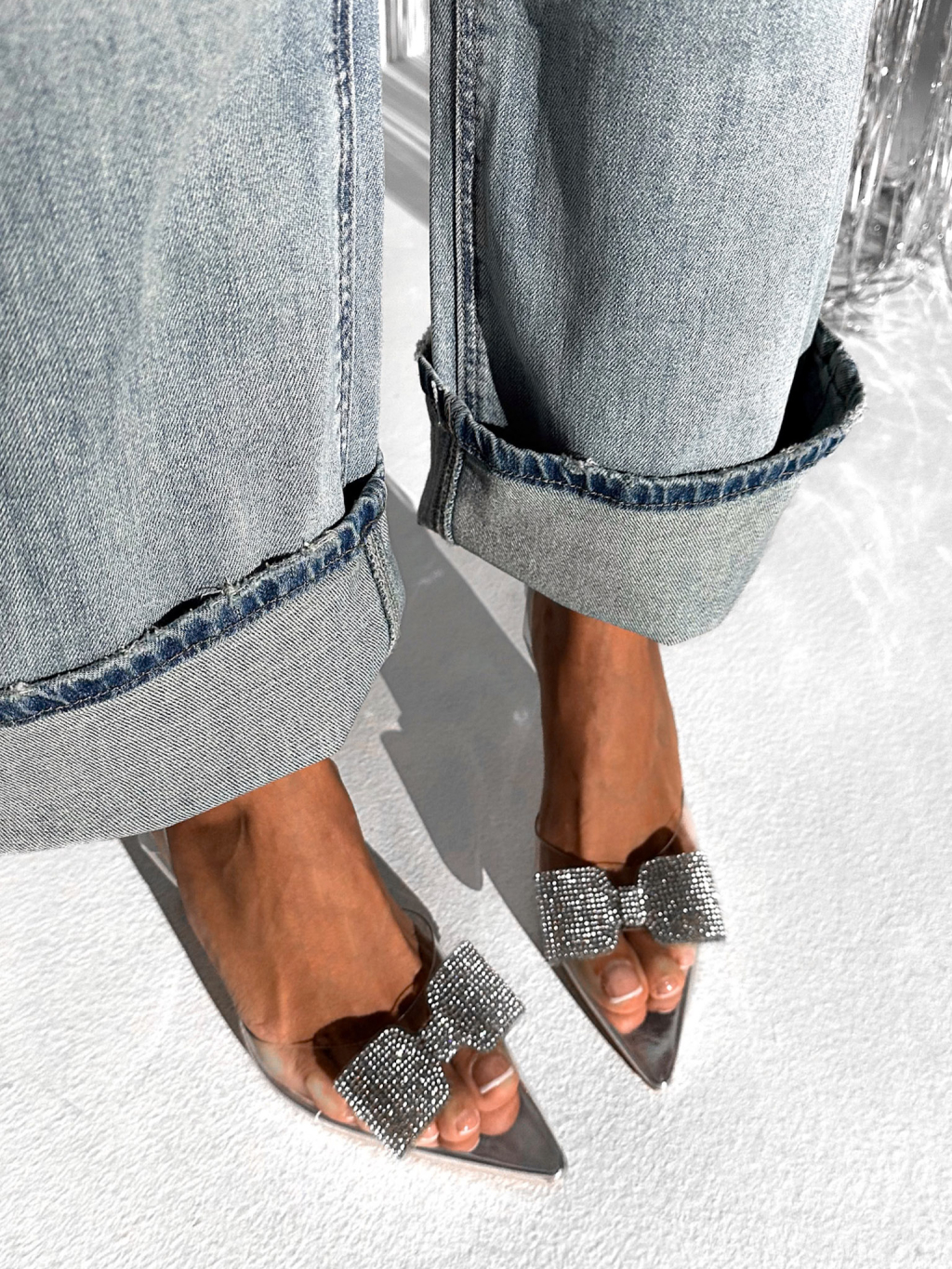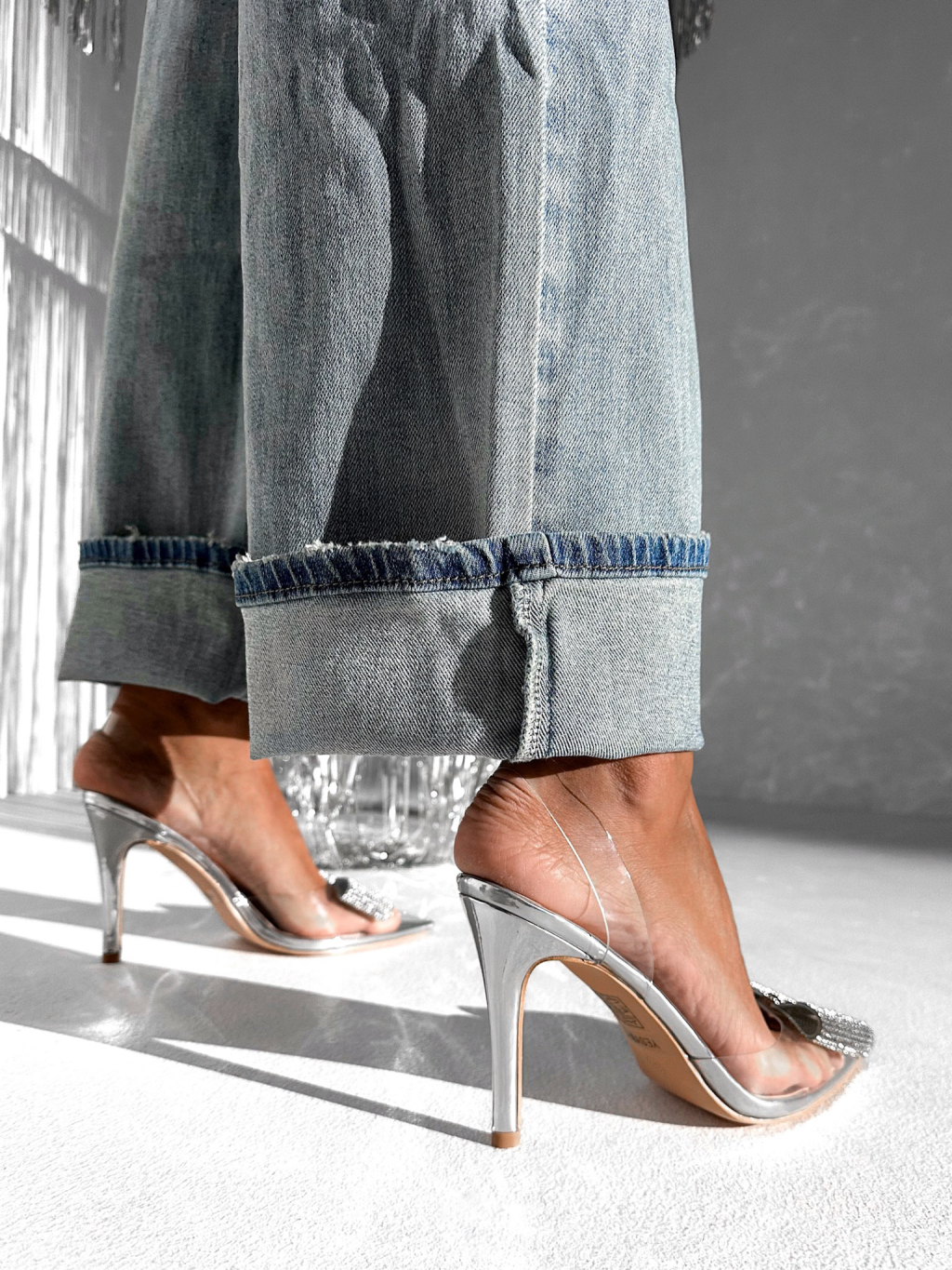 Strieborné transparentné lodičky na podpätku GAMLYN s mašľou