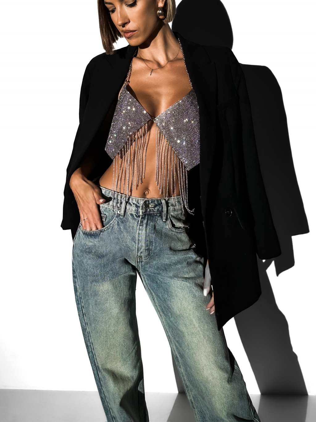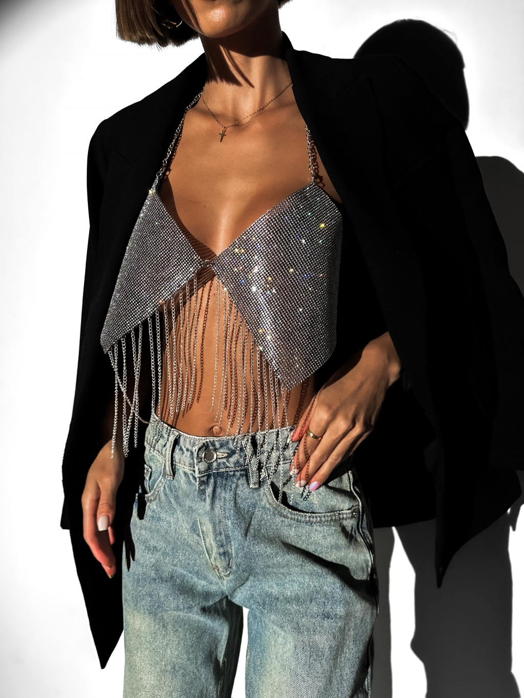 Čierny trblietavý flitrový top SELMAR s kamienkami