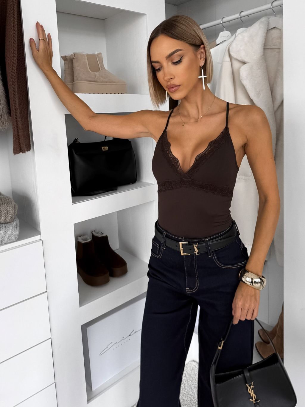 Hnedé elegantné body MIREVON s čipkou na ramienka