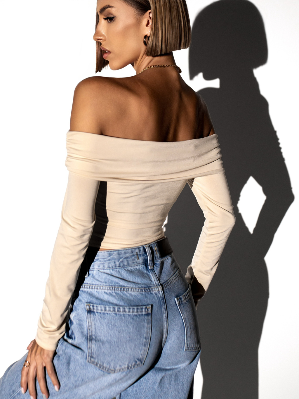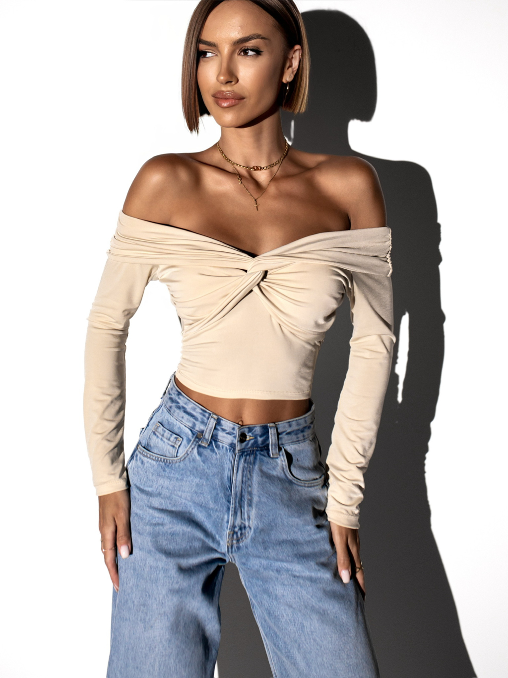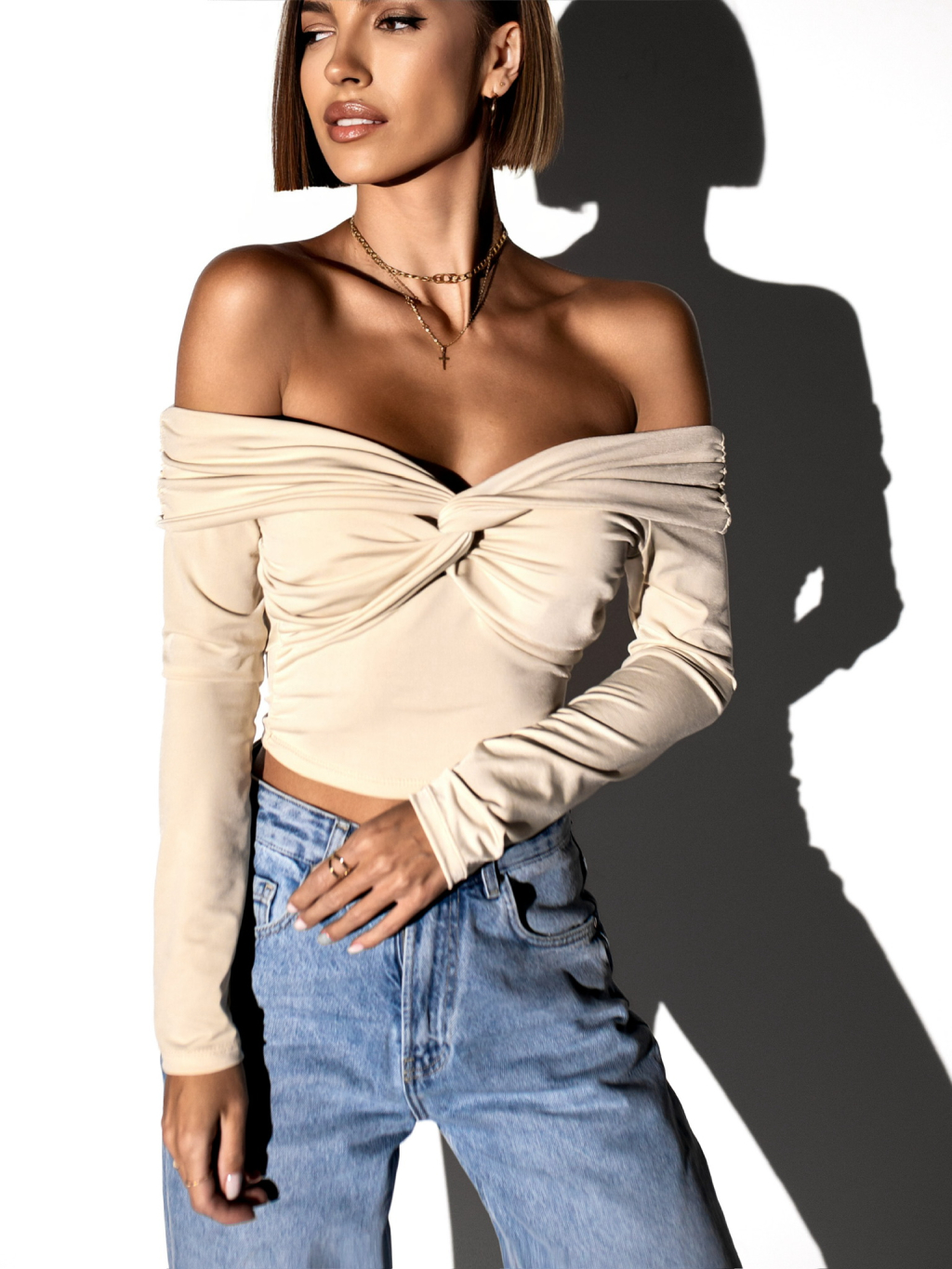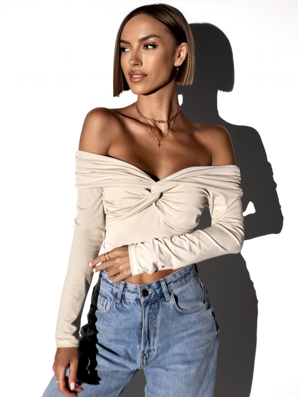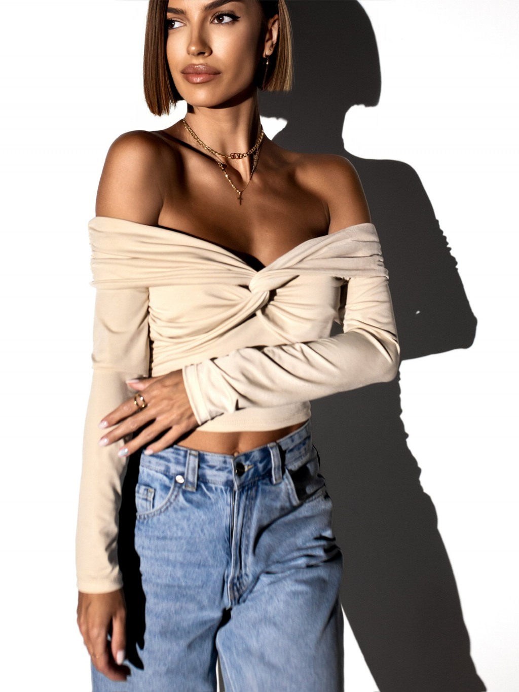 Krémový elegantný top PORFIRIO s dlhým rukávom