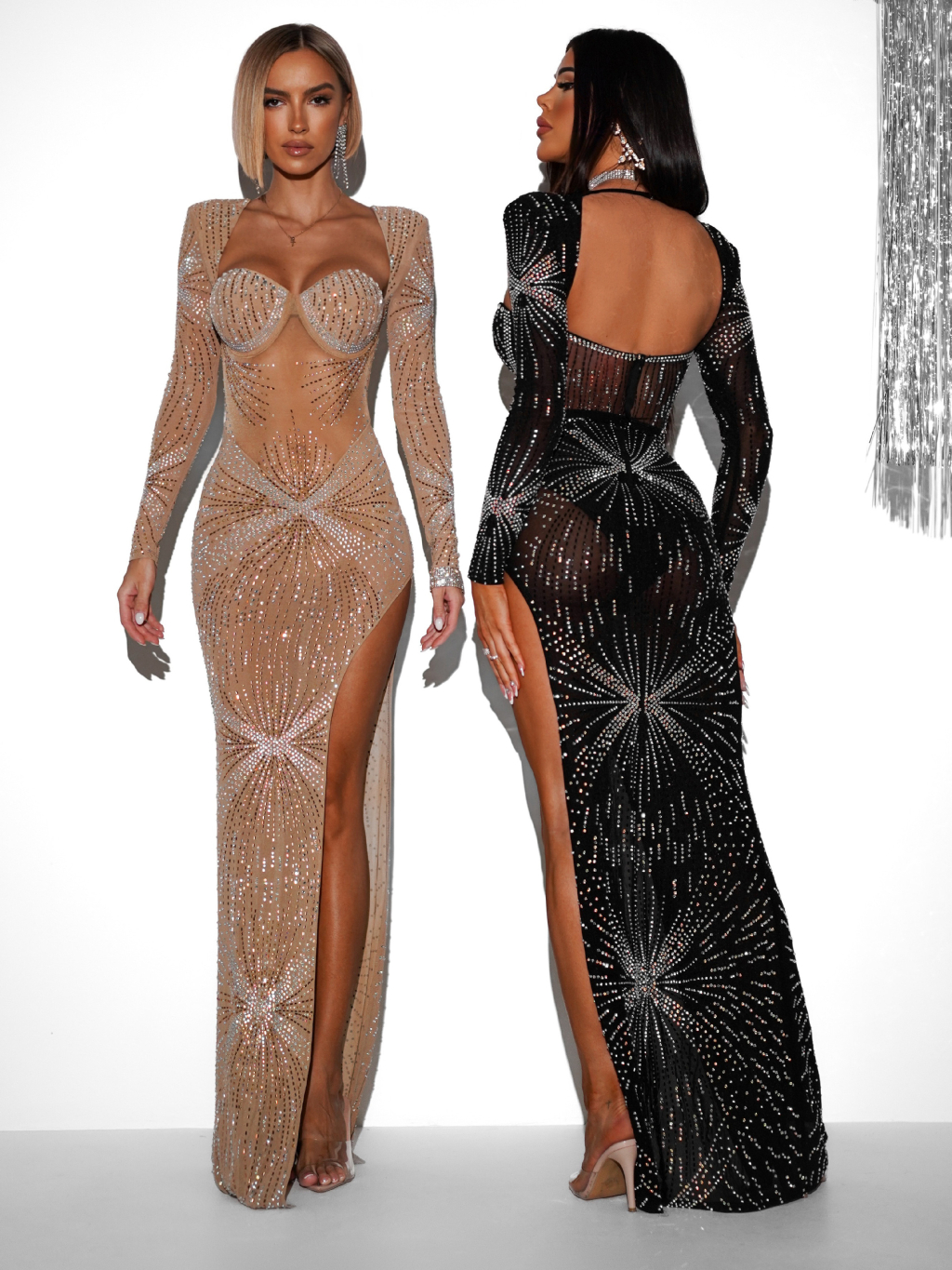 Čierne luxusné trblietavé večerné šaty JAZUCI s rázporkom a bodmi
