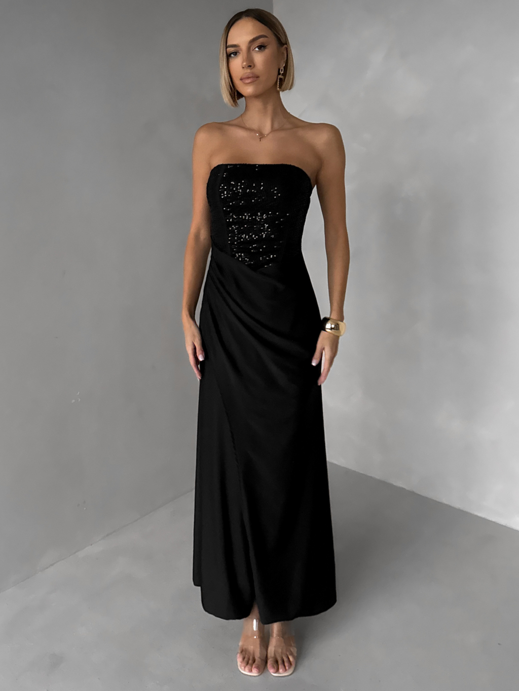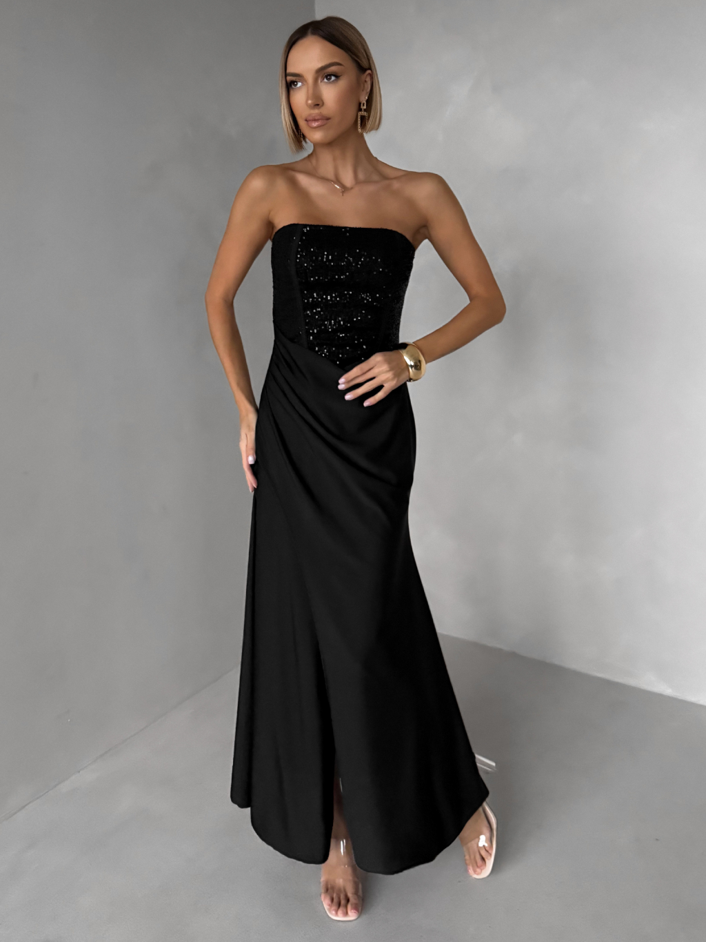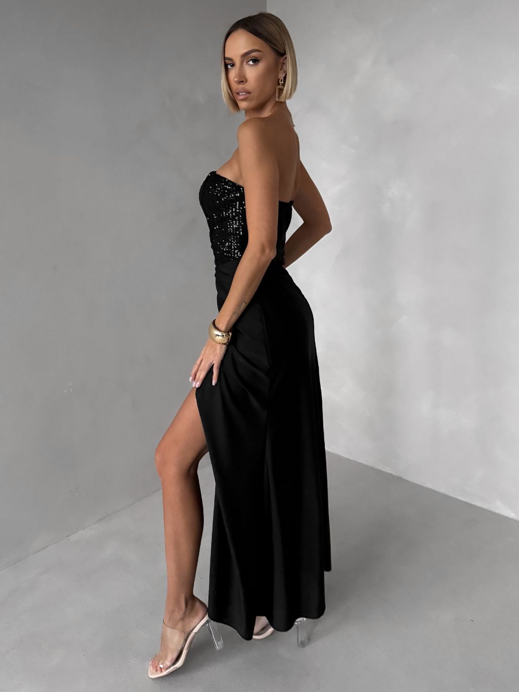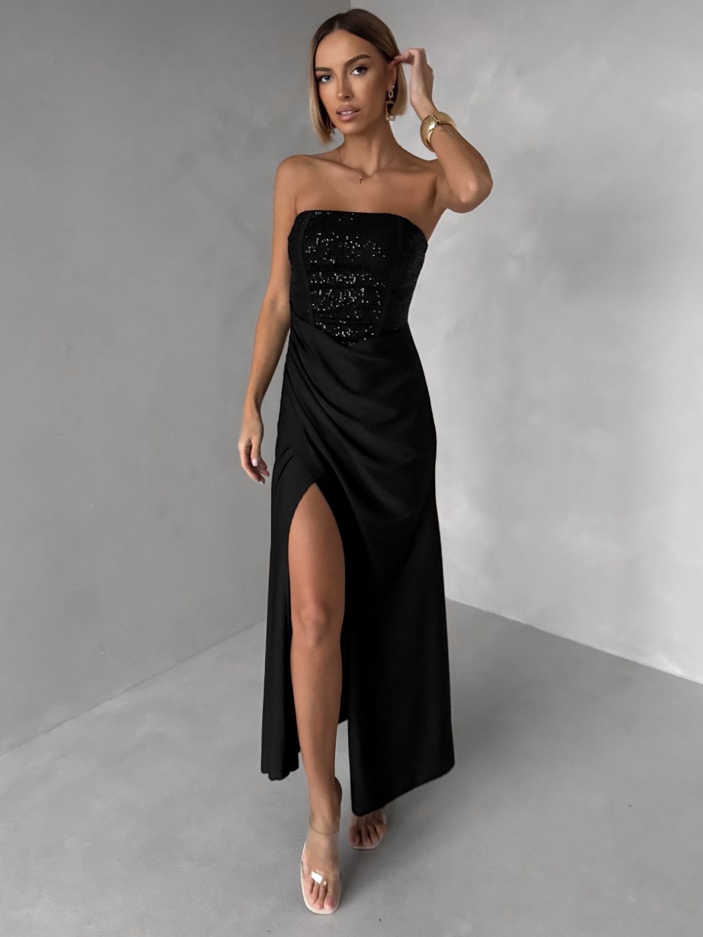 Čierne trblietavé spoločenské dlhé šaty AVENZA s rázporkom