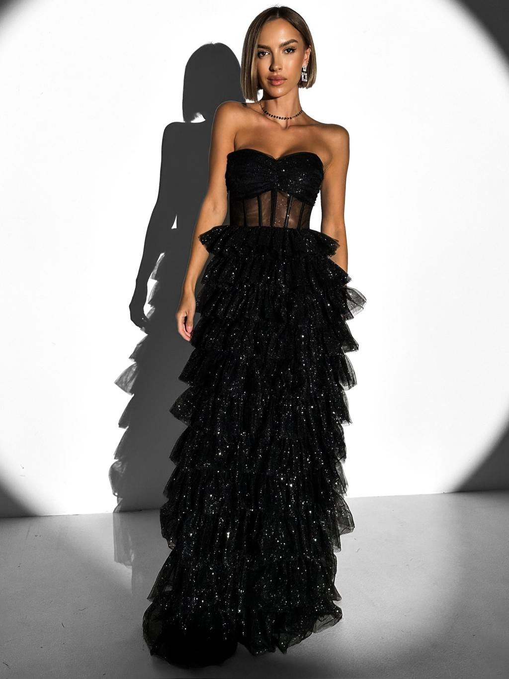 Čierne trblietavé tylové šaty CAITLINE s volánmi