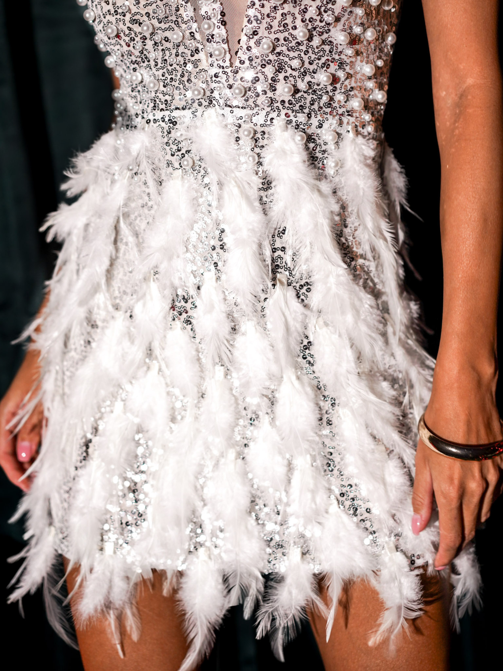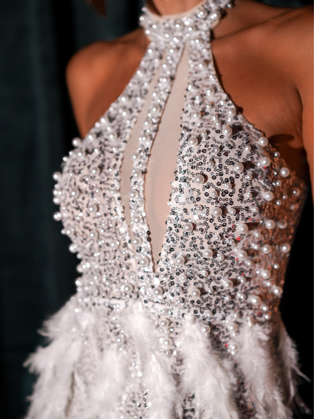 Luxusné strieborné kokteilové šaty BOZANA s pierkami