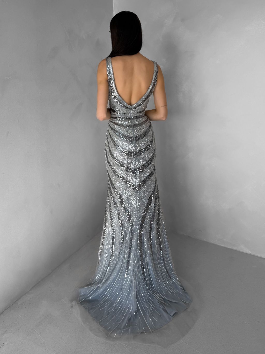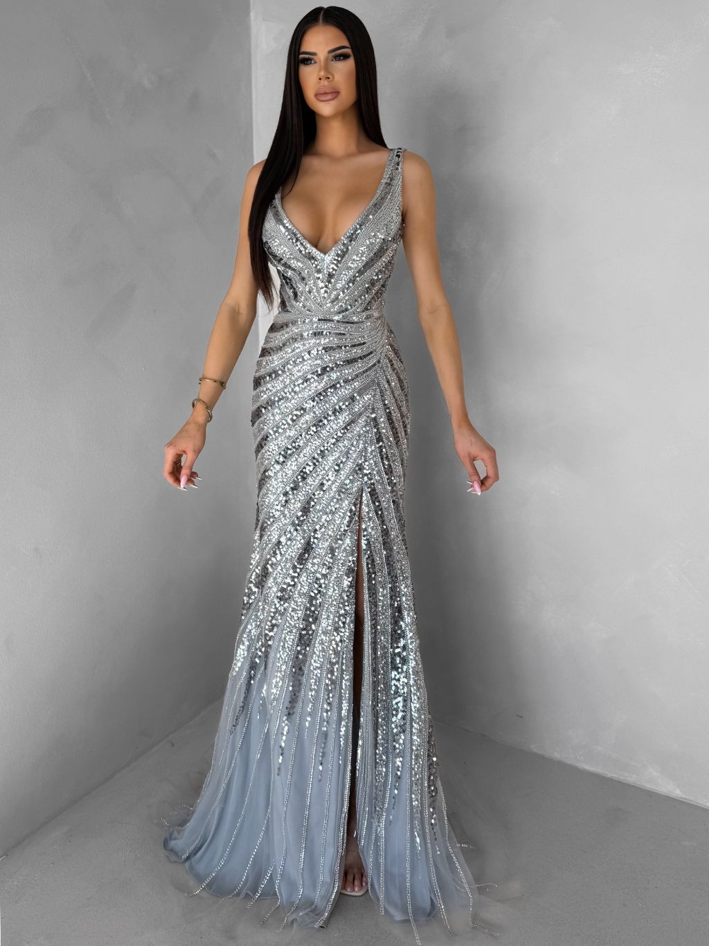 Strieborné luxusné dlhé trblietavé šaty MISTRALIS s rázporkom