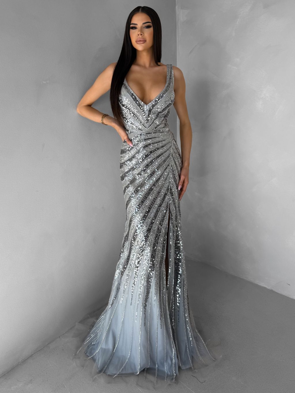 Strieborné luxusné dlhé trblietavé šaty MISTRALIS s rázporkom