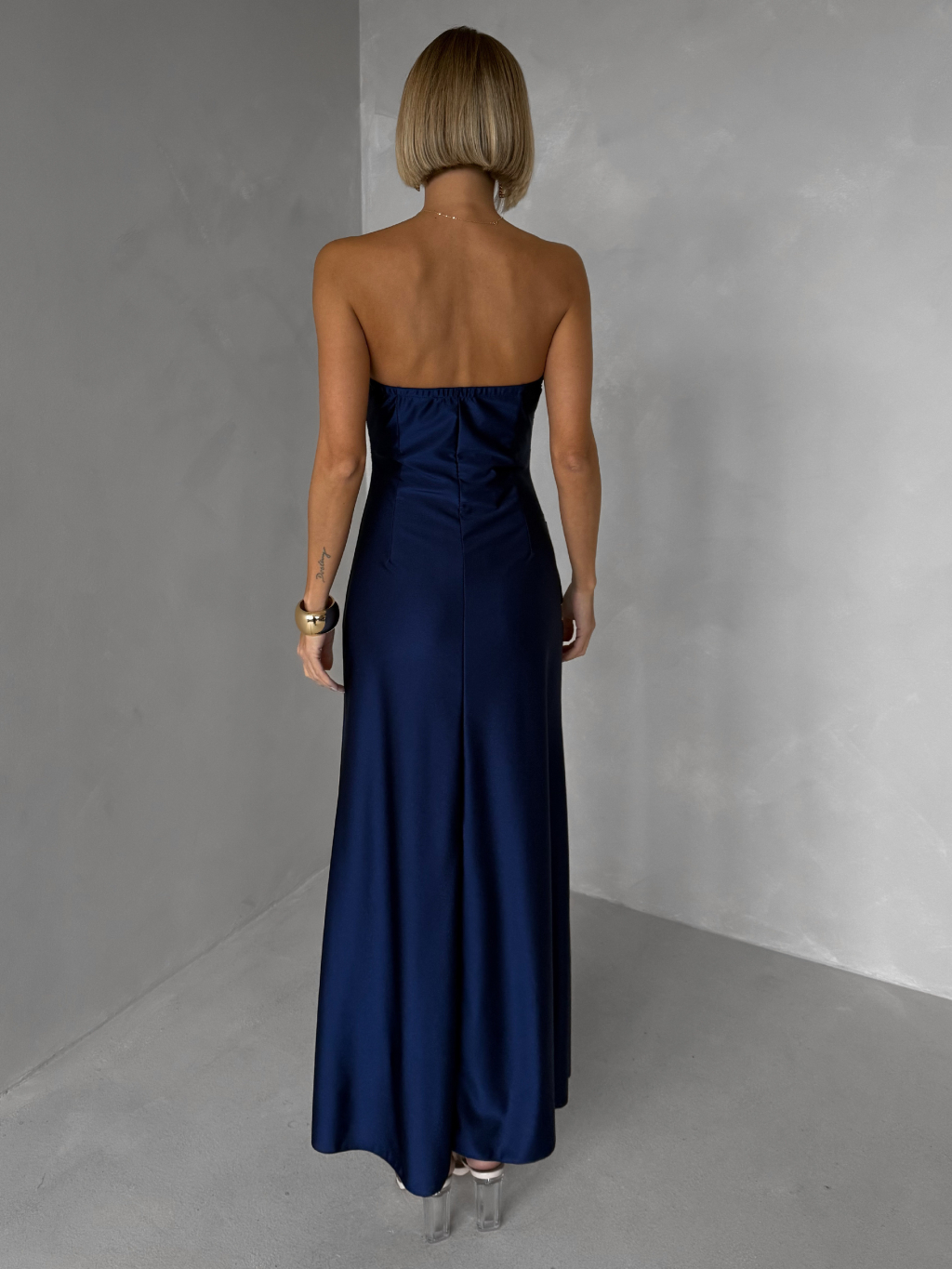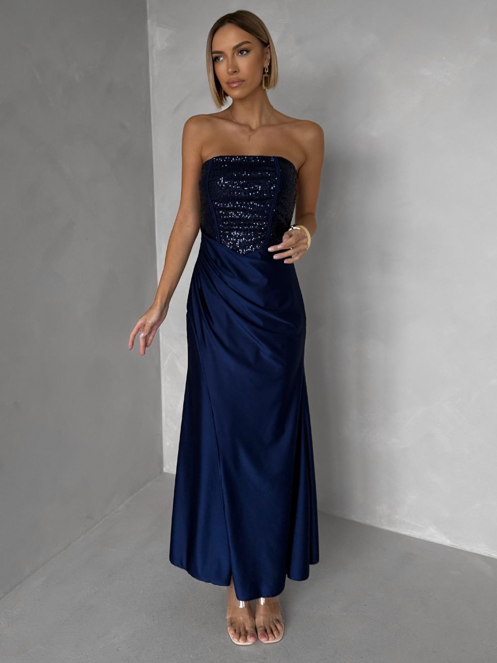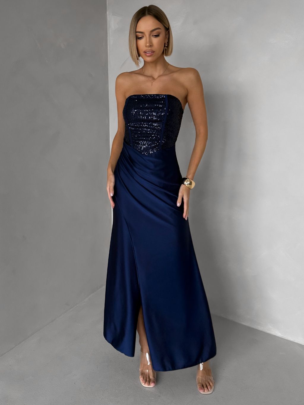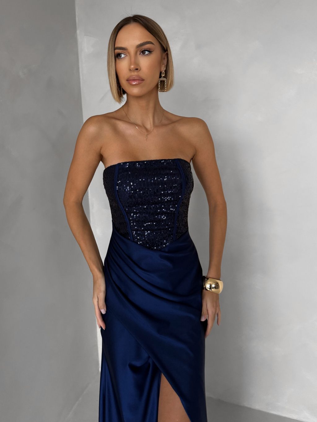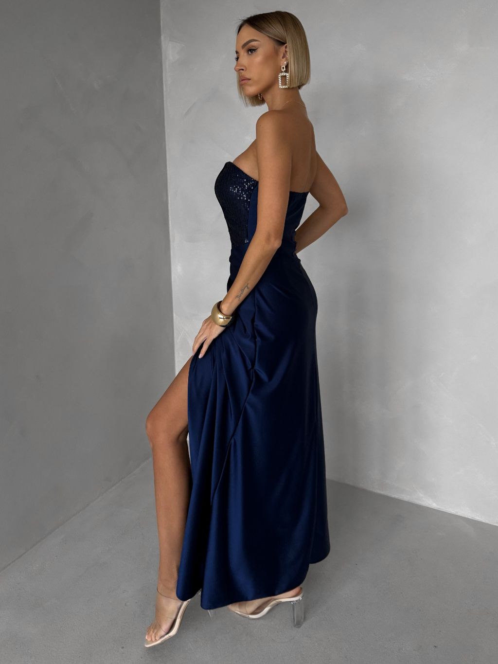 Tmavomodré trblietavé korzetové spoločenské šaty AVENZA s rázporkom