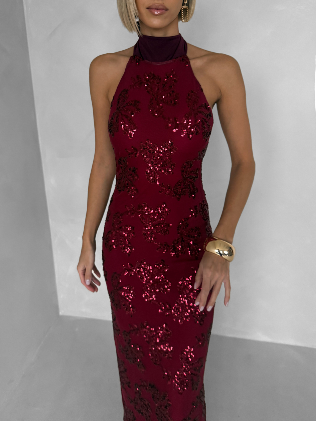 Vínové spoločenské dlhé šaty VELVET s flitrami