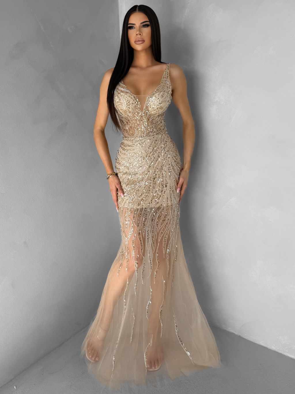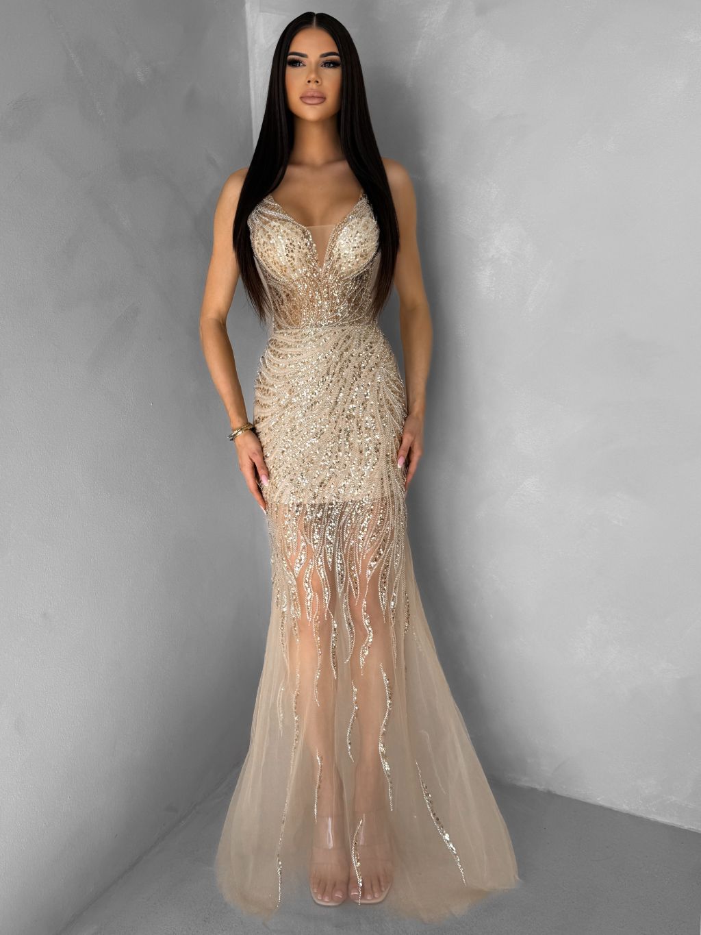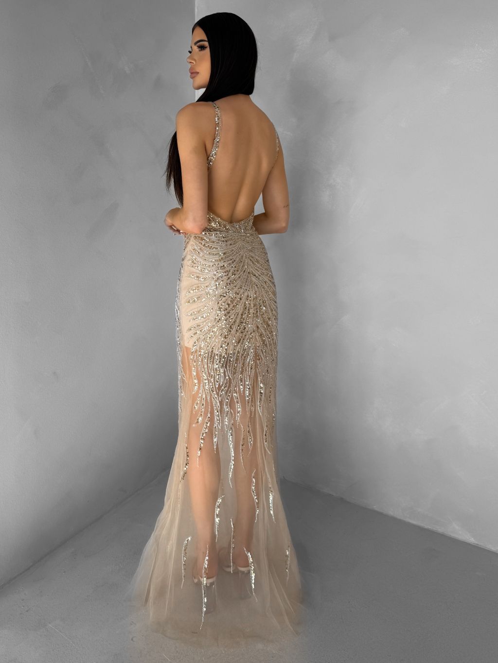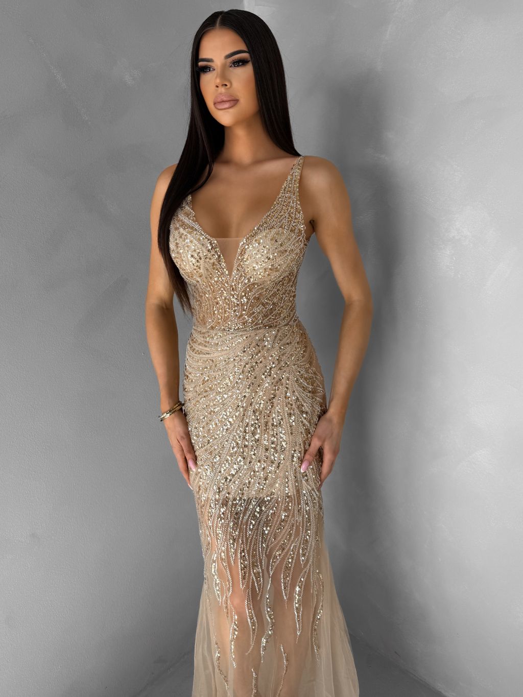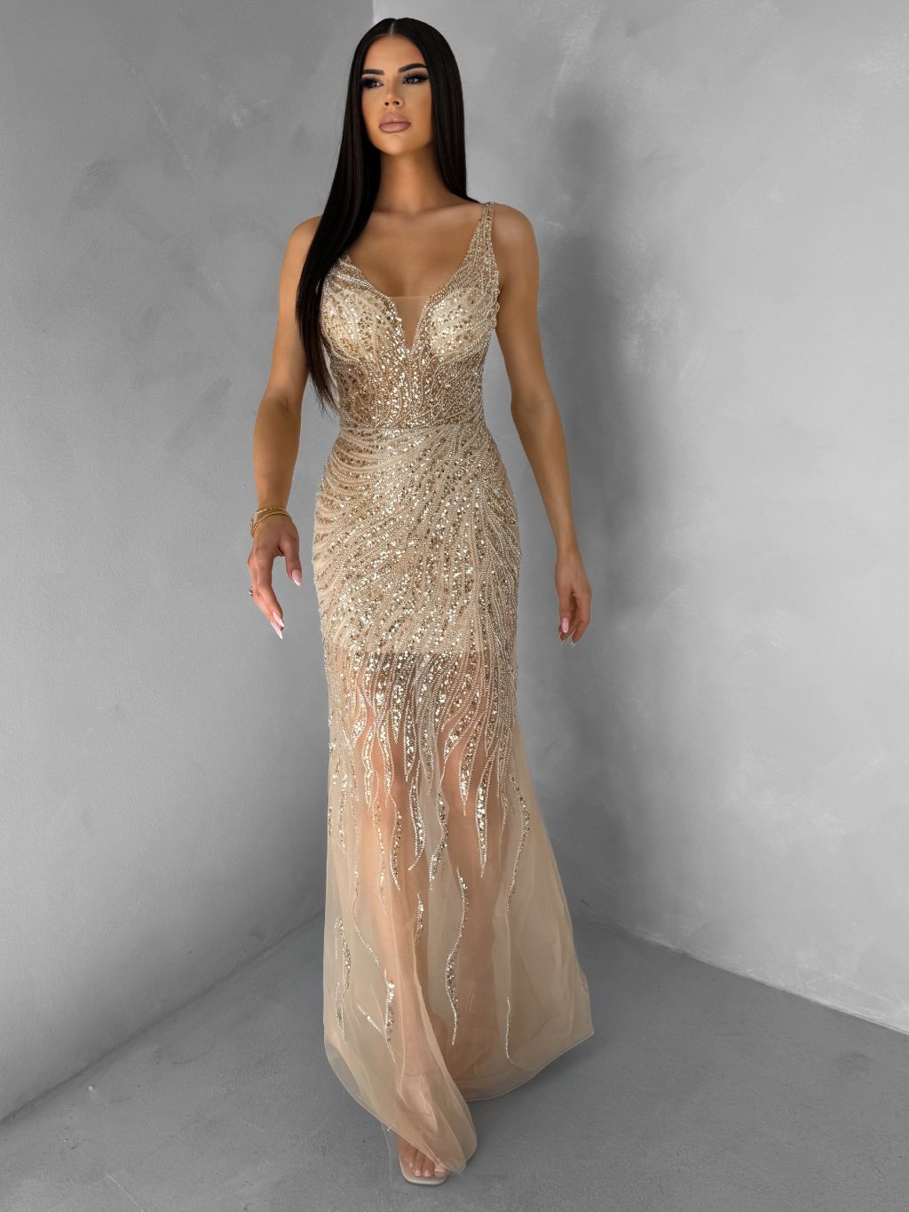 Zlaté trblietavé luxusné plesové nude šaty ROVENSA