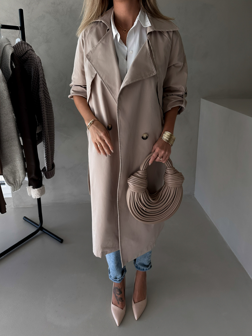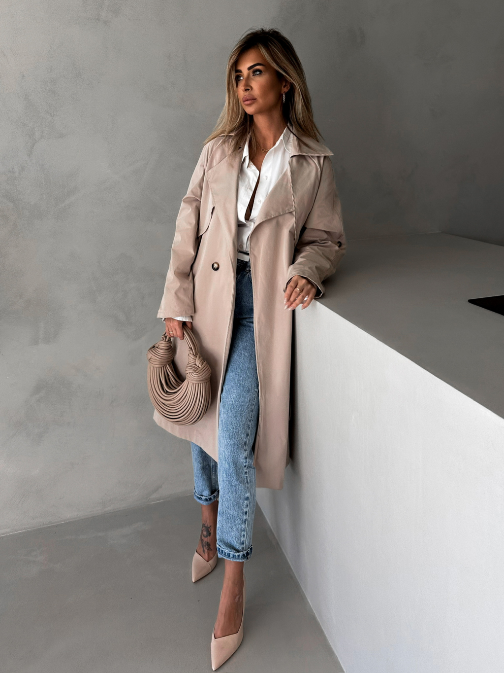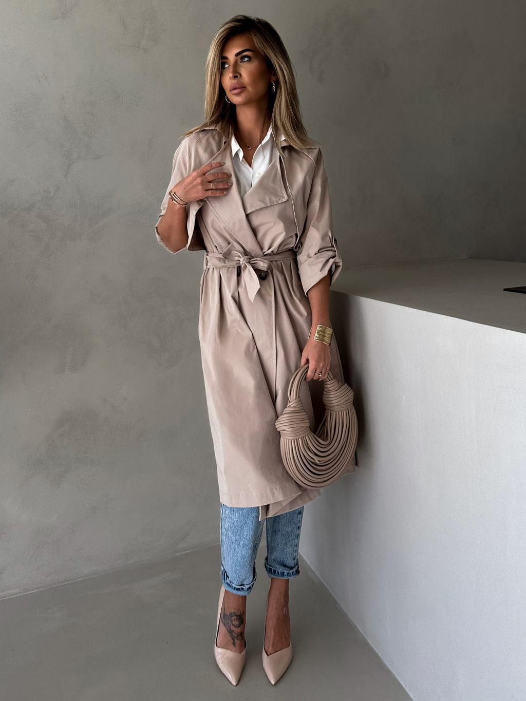 Béžový trenčkot dlhý kabát DOLLA