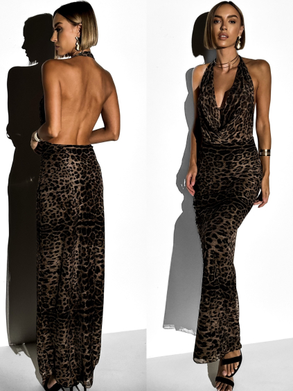 Hnedé dlhé spoločenské šaty TAVOLIE s holým chrbtom