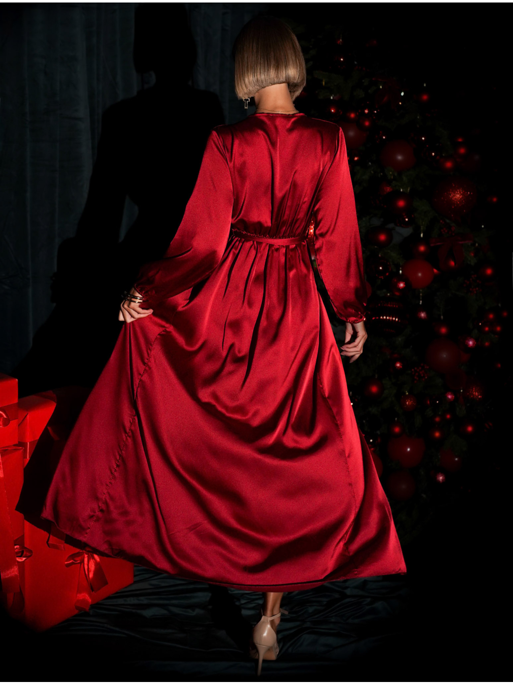 Bordó vianočné saténové šaty WOMAN s dlhým rukávom