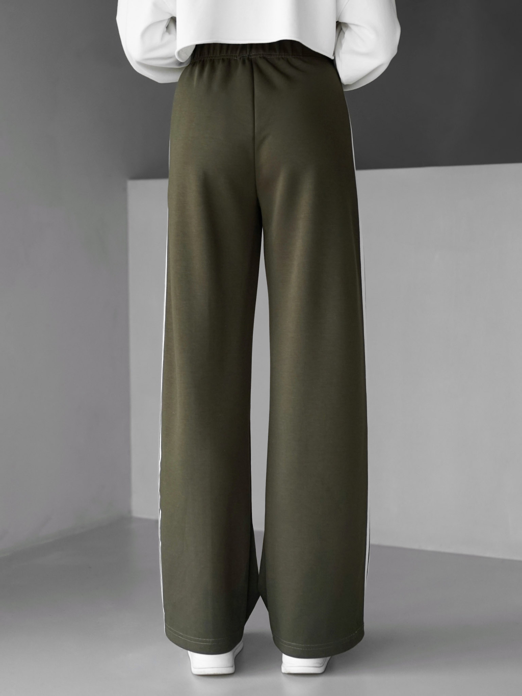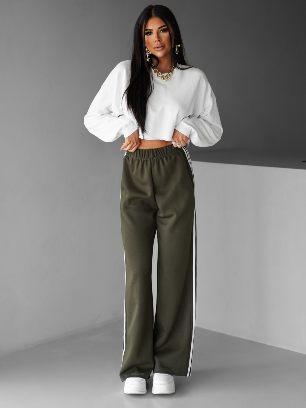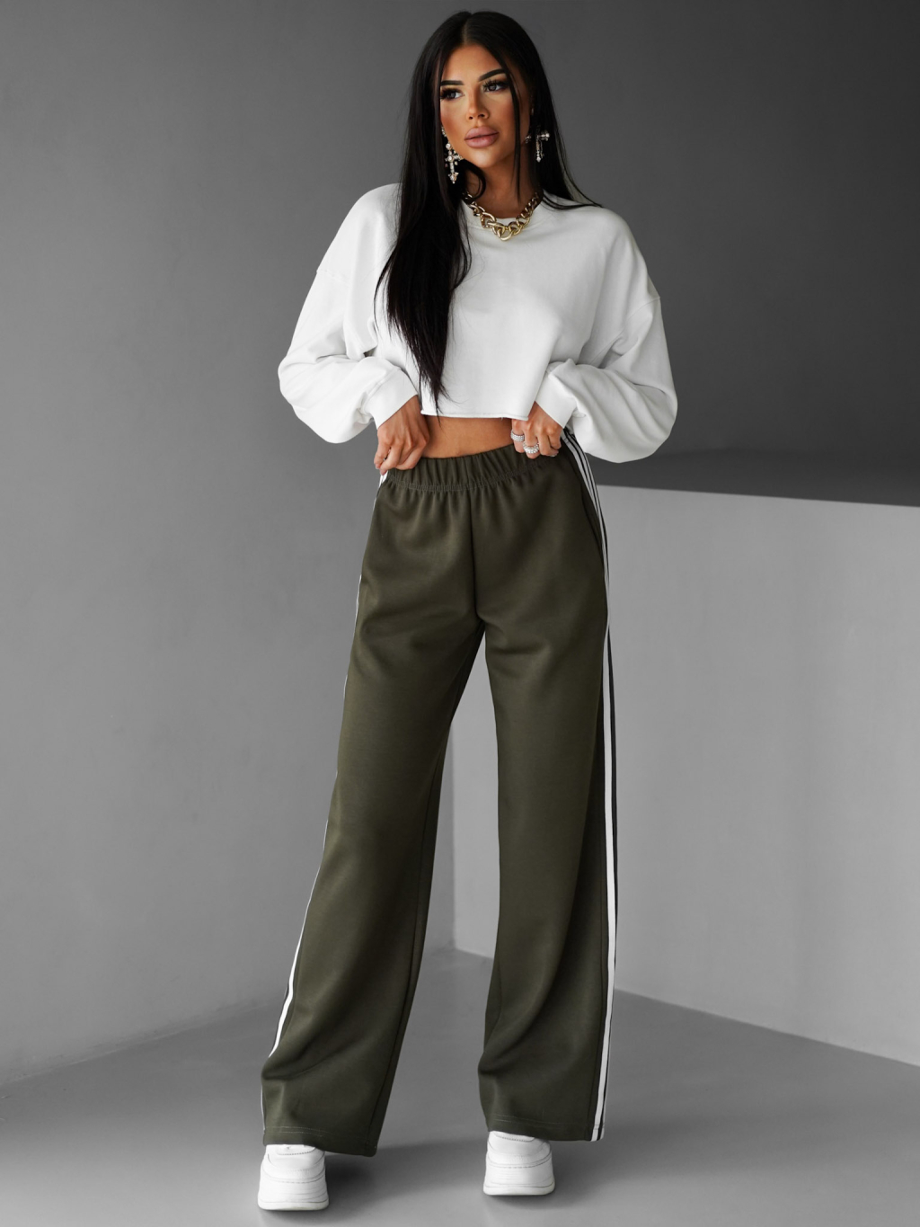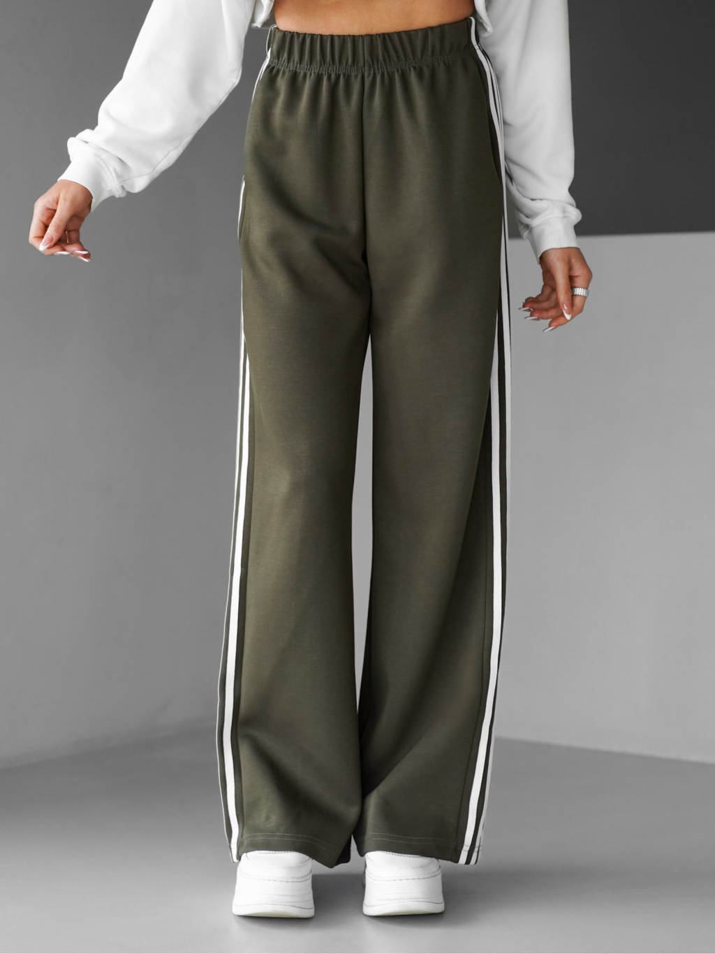 Kaki široké štýlové tepláky EDALLA s pruhmi