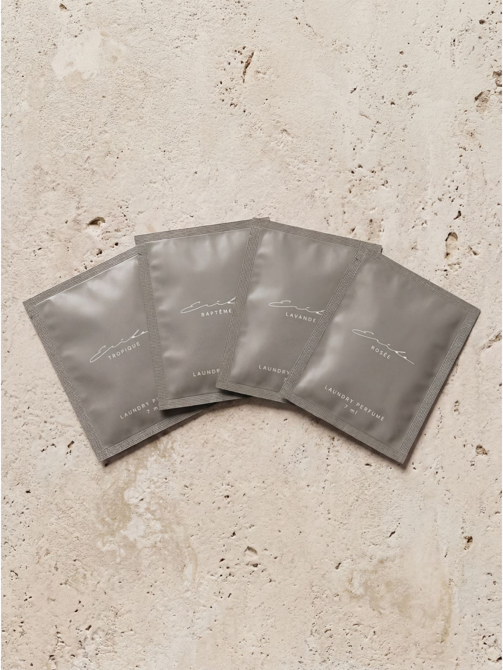 Skúšobný set vzoriek parfumov na pranie obsahuje všetky štyri naše vône: BAPTÊME, LAVANDÉE, ROSÉE a TROPIQÉE.