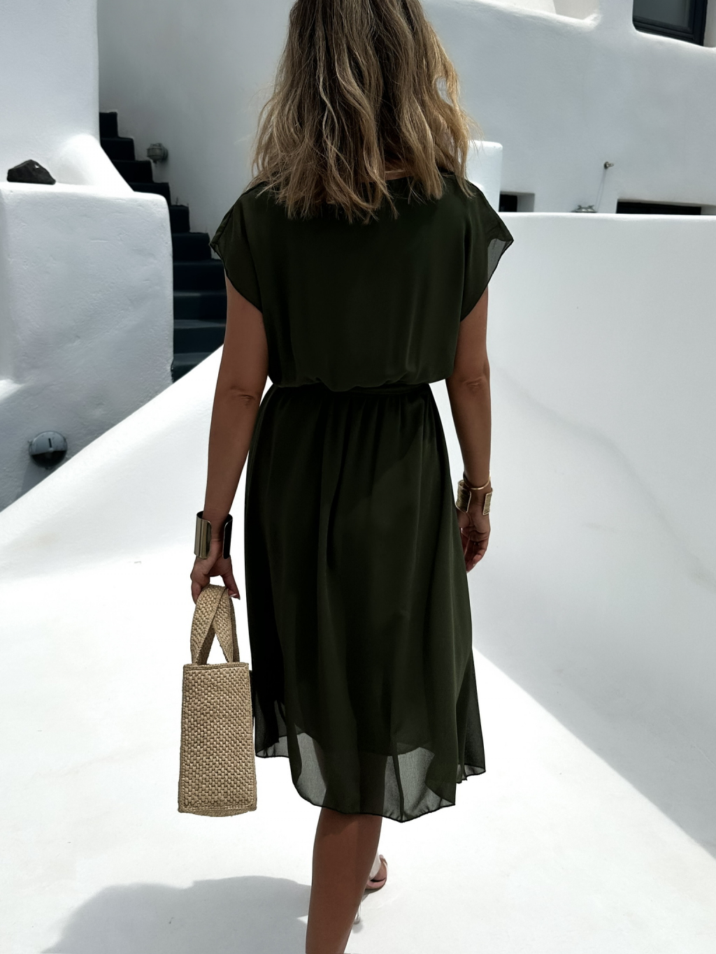 Khaki elegantné splývavé šaty EDVIN s výstrihom