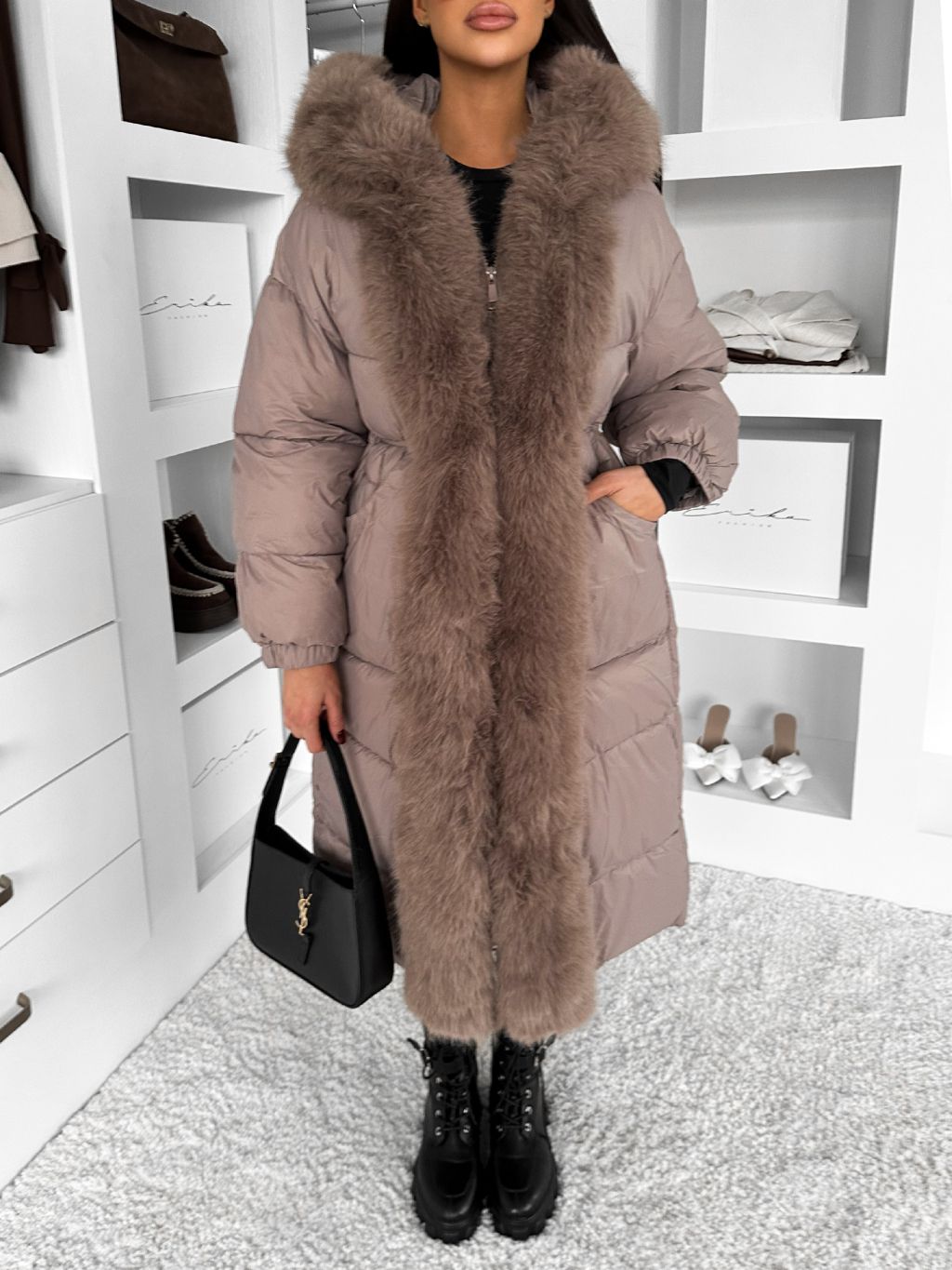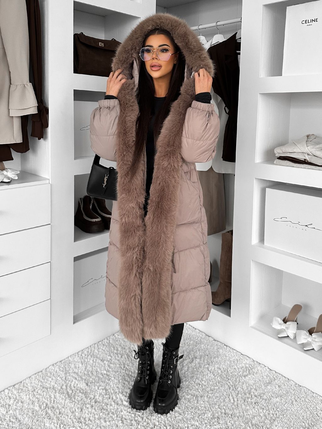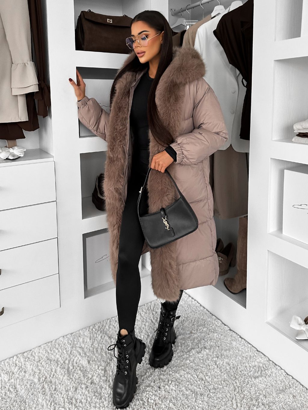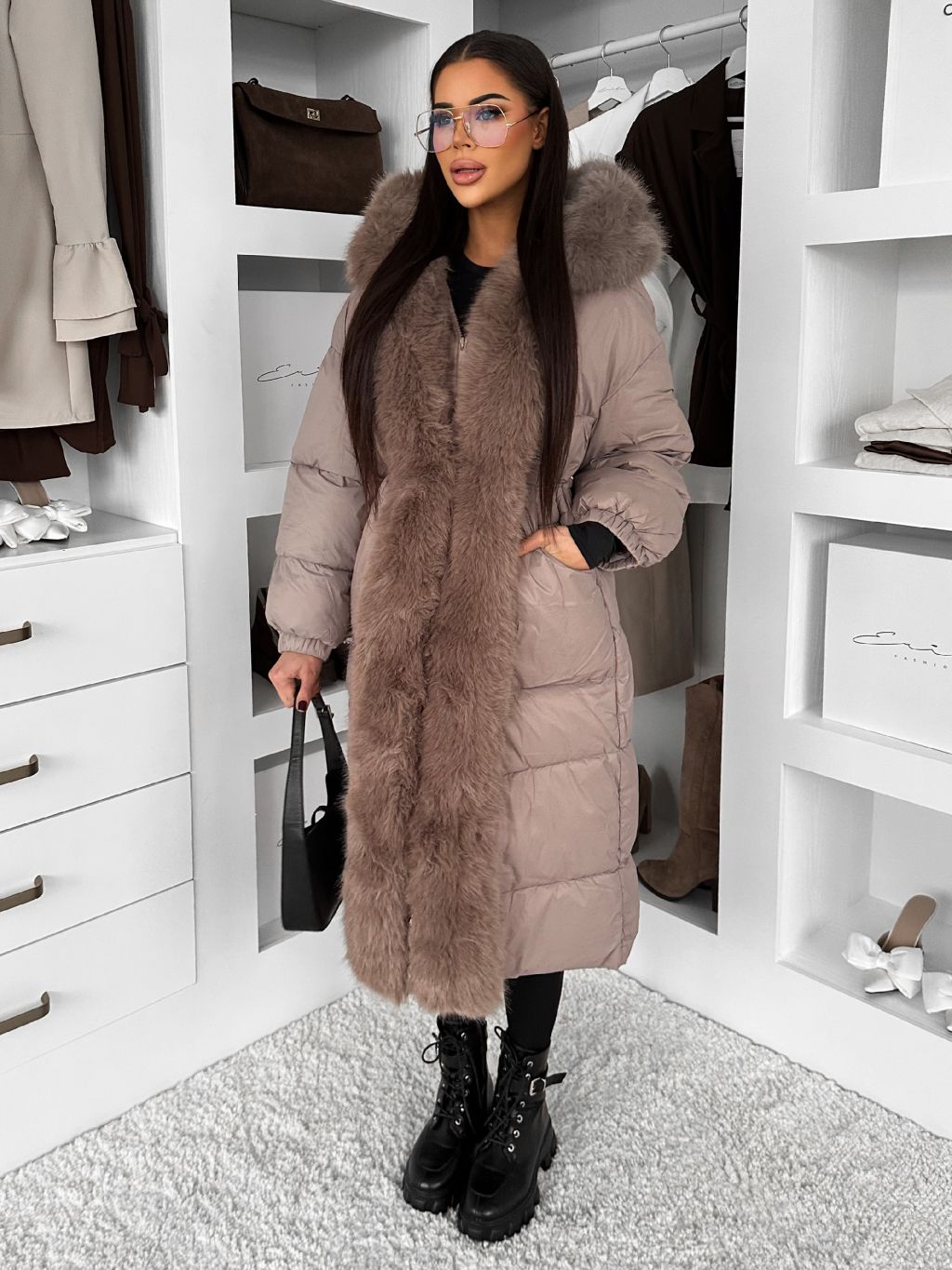 Béžová dlhá prešívaná zimná bunda TAREVO s kožúškom