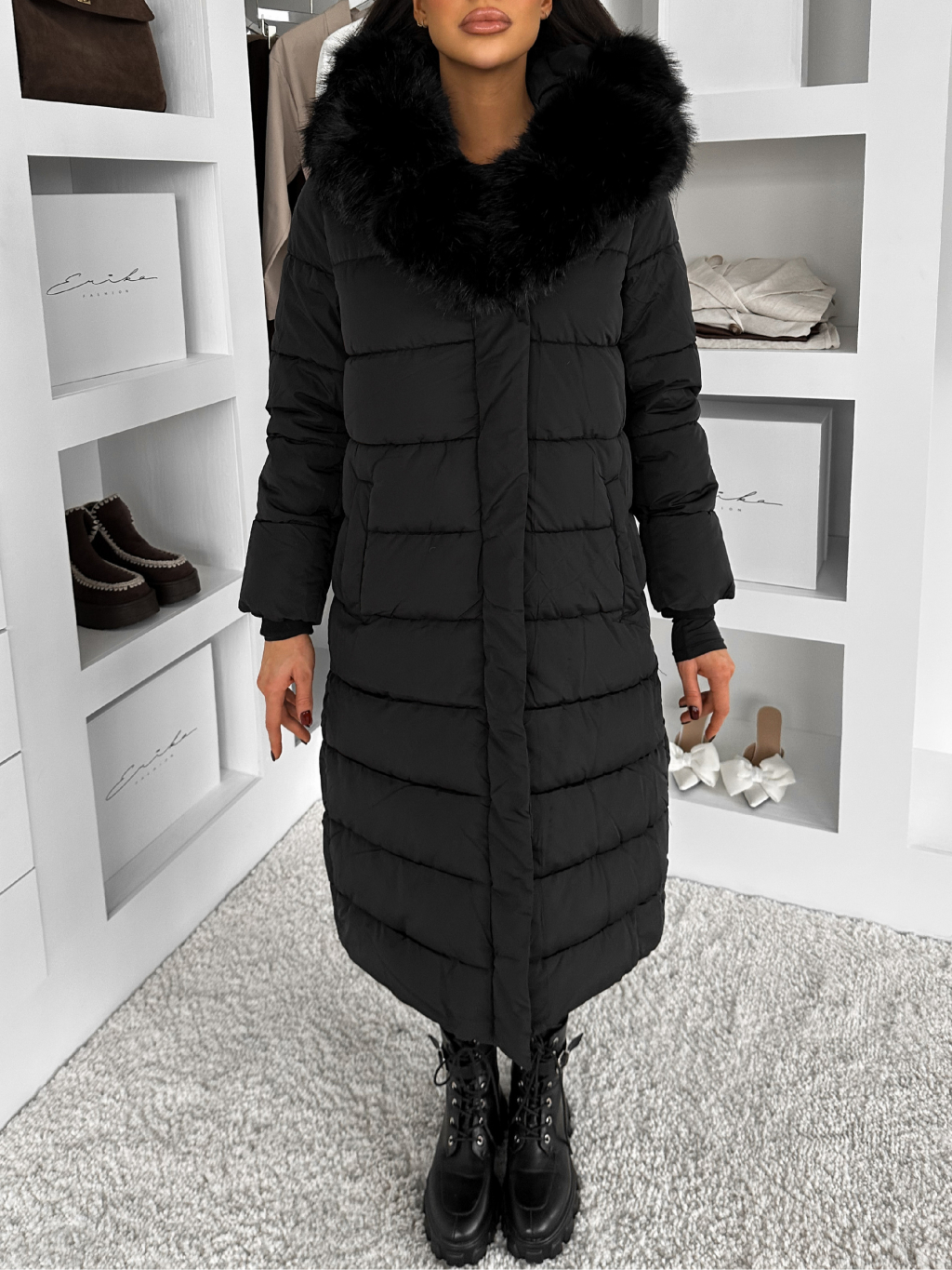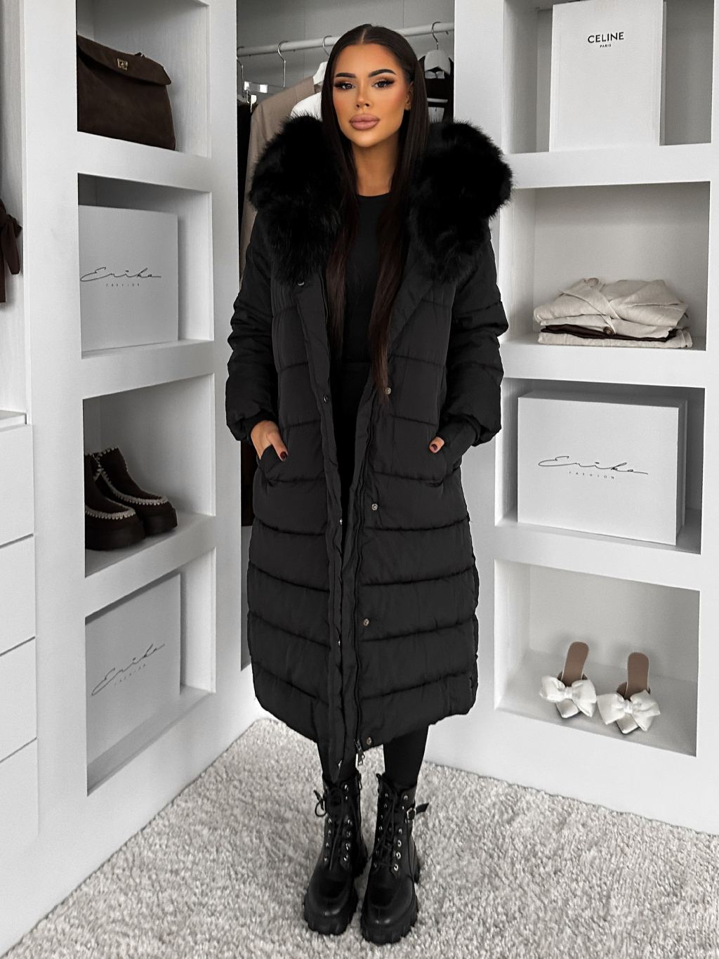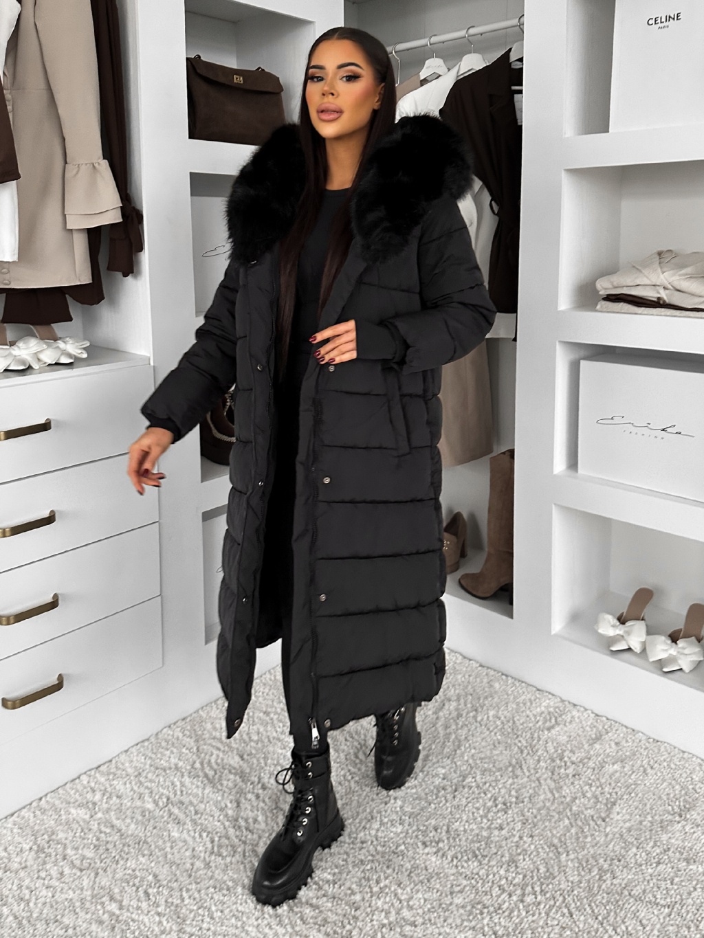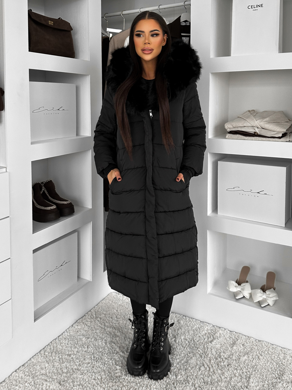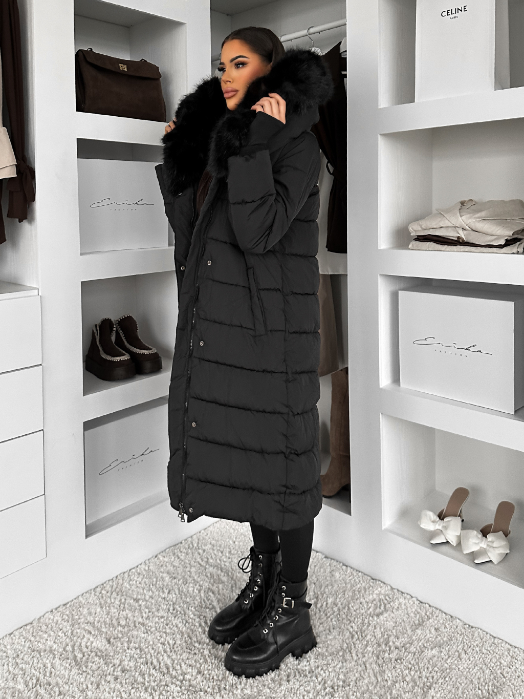 Čierna dlhá prešívaná bunda REWONA s kožúškom