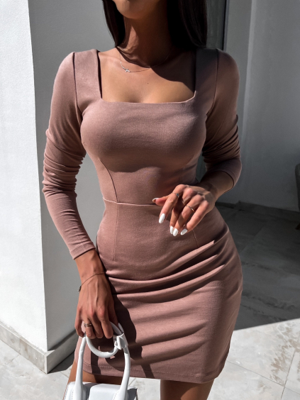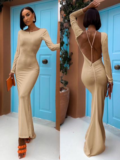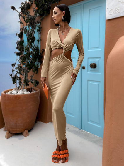 Béžové dlhé elegantné šaty LANTIC s dlhým rukávom