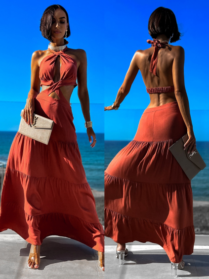 Oranžové lesklé elegantné šaty MENLEYS so zlatými ramienkami